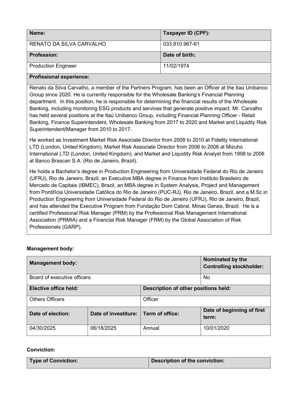 Name: Taxpayer ID (CPF): RENATO DA SILVA CARVALHO 033.810.967-61 Profession: Date of birth: Production Engineer 11/02/1974 Profissional experience: Renato da Silva Carvalho, a member of the Partners Program, has been an Officer at the Itaú Unibanco Group since 2020. He is currently responsible for the Wholesale Banking’s Financial Planning department. In this position, he is responsible for determining the financial results of the Wholesale Banking, including monitoring ESG products and services that generate positive impact. Mr. Carvalho has held several positions at the Itaú Unibanco Group, including Financial Planning Officer - Retail Banking, Finance Superintendent, Wholesale Banking from 2017 to 2020 and Market and Liquidity Risk Superintendent/Manager from 2010 to 2017. He worked as Investment Market Risk Associate Director from 2008 to 2010 at Fidelity International LTD (London, United Kingdom), Market Risk Associate Director from 2006 to 2008 at Mizuho International LTD (London, United Kingdom), and Market and Liquidity Risk Analyst from 1998 to 2006 at Banco Brascan S.A. (Rio de Janeiro, Brazil). He holds a Bachelor’s degree in Production Engineering from Universidade Federal do Rio de Janeiro (UFRJ), Rio de Janeiro, Brazil, an Executive MBA degree in Finance from Instituto Brasileiro de Mercado de Capitais (IBMEC), Brazil, an MBA degree in System Analysis, Project and Management from Pontifícia Universidade Católica do Rio de Janeiro (PUC-RJ), Rio de Janeiro, Brazil, and a M.Sc.in Production Engineering from Universidade Federal do Rio de Janeiro (UFRJ), Rio de Janeiro, Brazil, and has attended the Executive Program from Fundação Dom Cabral, Minas Gerais, Brazil. He is a certified Professional Risk Manager (PRM) by the Professional Risk Management International Association (PRMIA) and a Financial Risk Manager (FRM) by the Global Association of Risk Professionals (GARP). Management body: Management body: Nominated by the Controlling stockholder: Board of executive officers No Elective office held: Description of other positions held: Others Officers Officer Date of election: Date of investiture: Term of office: Date of beginning of first term: 04/30/2025 06/18/2025 Annual 10/01/2020 Conviction: Type of Conviction: Description of the conviction: