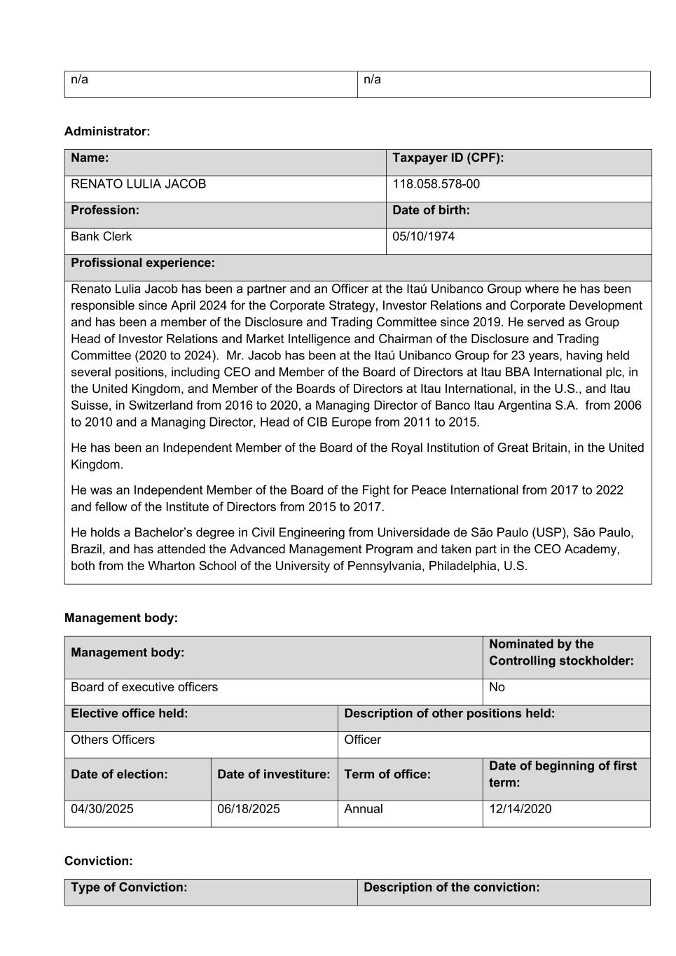 n/a n/a Administrator: Name: Taxpayer ID (CPF): RENATO LULIA JACOB 118.058.578-00 Profession: Date of birth: Bank Clerk 05/10/1974 Profissional experience: Renato Lulia Jacob has been a partner and an Officer at the Itaú Unibanco Group where he has been responsible since April 2024 for the Corporate Strategy, Investor Relations and Corporate Development and has been a member of the Disclosure and Trading Committee since 2019. He served as Group Head of Investor Relations and Market Intelligence and Chairman of the Disclosure and Trading Committee (2020 to 2024). Mr. Jacob has been at the Itaú Unibanco Group for 23 years, having held several positions, including CEO and Member of the Board of Directors at Itau BBA International plc, in the United Kingdom, and Member of the Boards of Directors at Itau International, in the U.S., and Itau Suisse, in Switzerland from 2016 to 2020, a Managing Director of Banco Itau Argentina S.A. from 2006 to 2010 and a Managing Director, Head of CIB Europe from 2011 to 2015. He has been an Independent Member of the Board of the Royal Institution of Great Britain, in the United Kingdom. He was an Independent Member of the Board of the Fight for Peace International from 2017 to 2022 and fellow of the Institute of Directors from 2015 to 2017. He holds a Bachelor’s degree in Civil Engineering from Universidade de São Paulo (USP), São Paulo, Brazil, and has attended the Advanced Management Program and taken part in the CEO Academy, both from the Wharton School of the University of Pennsylvania, Philadelphia, U.S. Management body: Management body: Nominated by the Controlling stockholder: Board of executive officers No Elective office held: Description of other positions held: Others Officers Officer Date of election: Date of investiture: Term of office: Date of beginning of first term: 04/30/2025 06/18/2025 Annual 12/14/2020 Conviction: Type of Conviction: Description of the conviction: