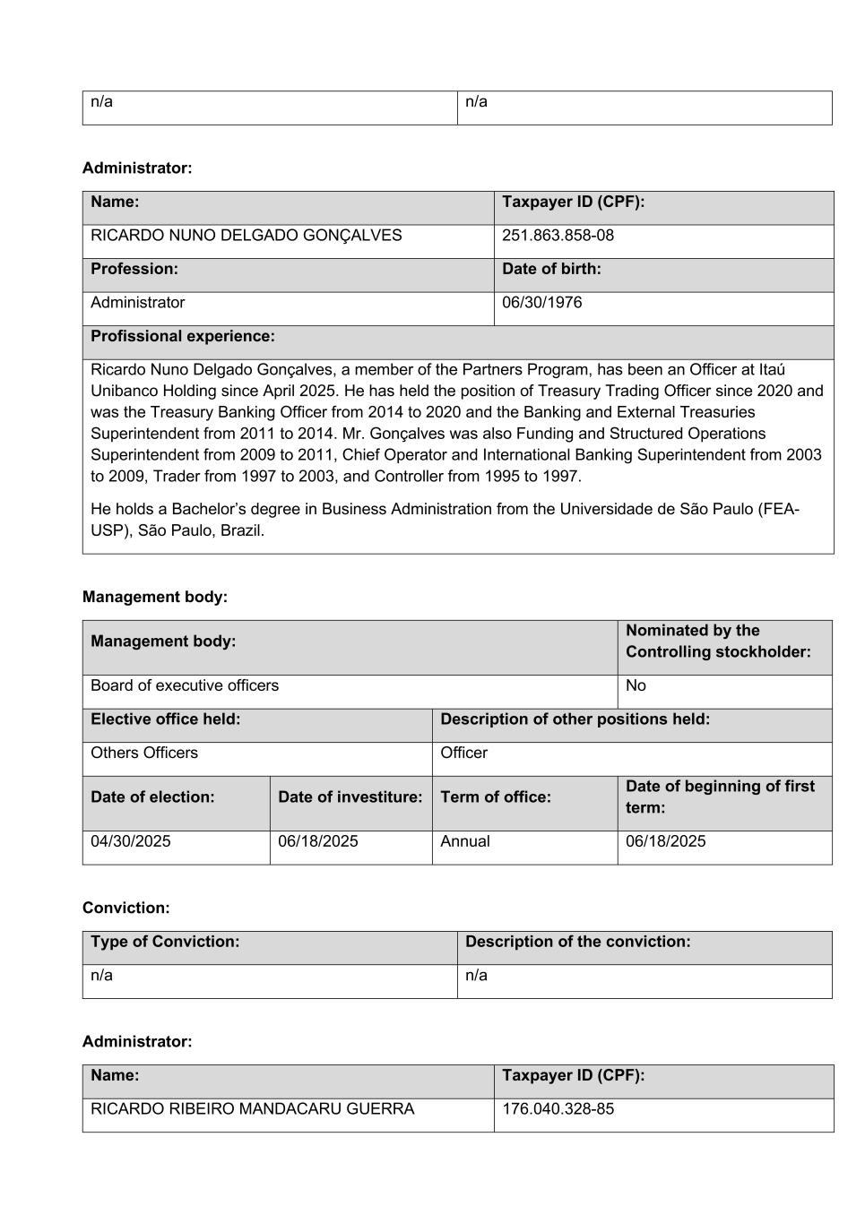 n/a n/a Administrator: Name: Taxpayer ID (CPF): RICARDO NUNO DELGADO GONÇALVES 251.863.858-08 Profession: Date of birth: Administrator 06/30/1976 Profissional experience: Ricardo Nuno Delgado Gonçalves, a member of the Partners Program, has been an Officer at Itaú Unibanco Holding since April 2025. He has held the position of Treasury Trading Officer since 2020 and was the Treasury Banking Officer from 2014 to 2020 and the Banking and External Treasuries Superintendent from 2011 to 2014. Mr. Gonçalves was also Funding and Structured Operations Superintendent from 2009 to 2011, Chief Operator and International Banking Superintendent from 2003 to 2009, Trader from 1997 to 2003, and Controller from 1995 to 1997. He holds a Bachelor’s degree in Business Administration from the Universidade de São Paulo (FEA- USP), São Paulo, Brazil. Management body: Management body: Nominated by the Controlling stockholder: Board of executive officers No Elective office held: Description of other positions held: Others Officers Officer Date of election: Date of investiture: Term of office: Date of beginning of first term: 04/30/2025 06/18/2025 Annual 06/18/2025 Conviction: Type of Conviction: Description of the conviction: n/a n/a Administrator: Name: Taxpayer ID (CPF): RICARDO RIBEIRO MANDACARU GUERRA 176.040.328-85