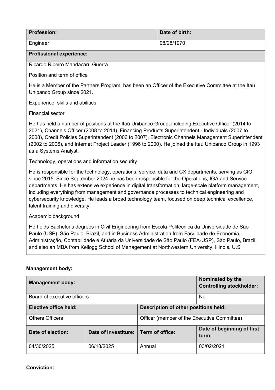 Profession: Date of birth: Engineer 08/28/1970 Profissional experience: Ricardo Ribeiro Mandacaru Guerra Position and term of office He is a Member of the Partners Program, has been an Officer of the Executive Committee at the Itaú Unibanco Group since 2021. Experience, skills and abilities Financial sector He has held a number of positions at the Itaú Unibanco Group, including Executive Officer (2014 to 2021), Channels Officer (2008 to 2014), Financing Products Superintendent - Individuals (2007 to 2008), Credit Policies Superintendent (2006 to 2007), Electronic Channels Management Superintendent (2002 to 2006), and Internet Project Leader (1996 to 2000). He joined the Itaú Unibanco Group in 1993 as a Systems Analyst. Technology, operations and information security He is responsible for the technology, operations, service, data and CX departments, serving as CIO since 2015. Since September 2024 he has been responsible for the Operations, IGA and Service departments. He has extensive experience in digital transformation, large-scale platform management, including everything from management and governance processes to technical engineering and cybersecurity knowledge. He leads a broad technology team, focused on deep technical excellence, talent training and diversity. Academic background He holds Bachelor’s degrees in Civil Engineering from Escola Politécnica da Universidade de São Paulo (USP), São Paulo, Brazil, and in Business Administration from Faculdade de Economia, Administração, Contabilidade e Atuária da Universidade de São Paulo (FEA-USP), São Paulo, Brazil, and also an MBA from Kellogg School of Management at Northwestern University, Illinois, U.S. Management body: Management body: Nominated by the Controlling stockholder: Board of executive officers No Elective office held: Description of other positions held: Others Officers Officer (member of the Executive Committee) Date of election: Date of investiture: Term of office: Date of beginning of first term: 04/30/2025 06/18/2025 Annual 03/02/2021 Conviction: