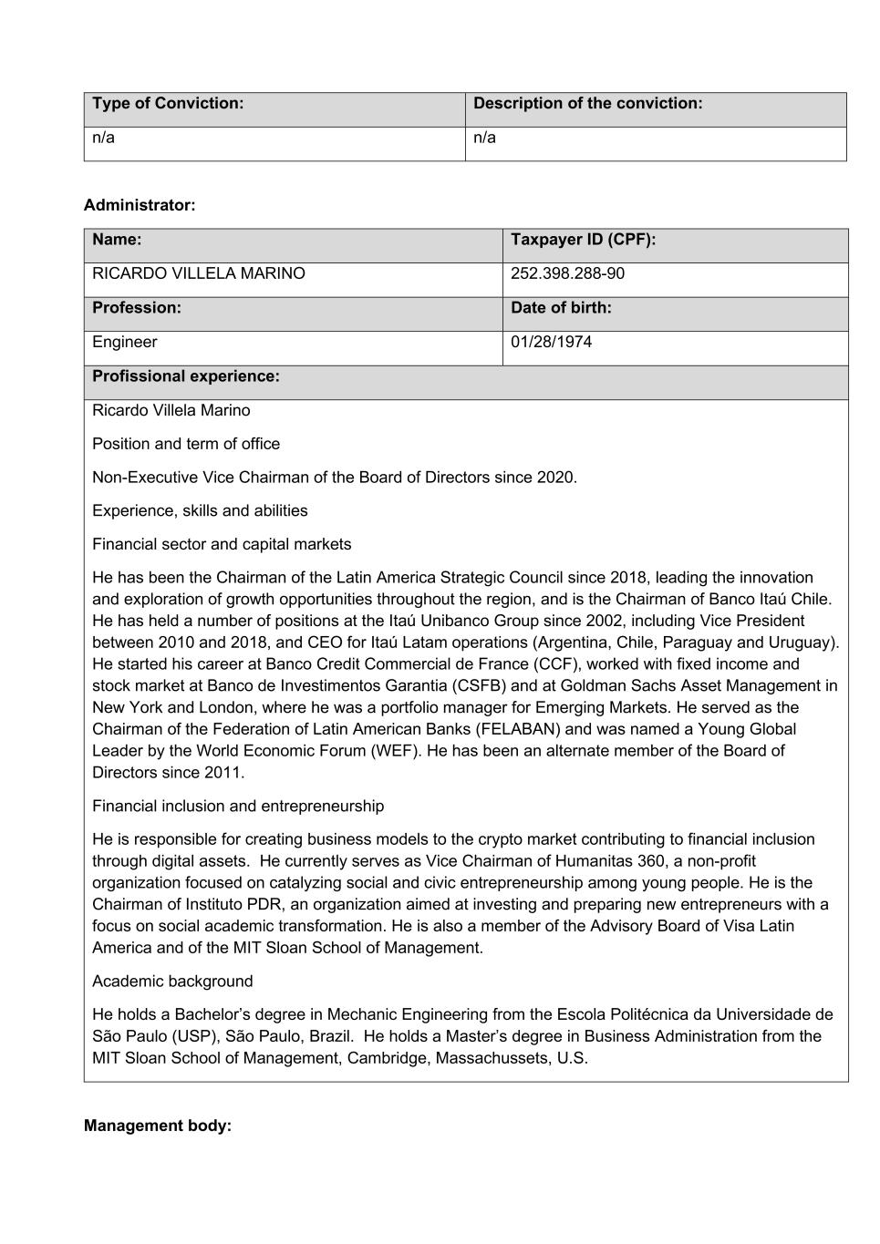 Type of Conviction: Description of the conviction: n/a n/a Administrator: Name: Taxpayer ID (CPF): RICARDO VILLELA MARINO 252.398.288-90 Profession: Date of birth: Engineer 01/28/1974 Profissional experience: Ricardo Villela Marino Position and term of office Non-Executive Vice Chairman of the Board of Directors since 2020. Experience, skills and abilities Financial sector and capital markets He has been the Chairman of the Latin America Strategic Council since 2018, leading the innovation and exploration of growth opportunities throughout the region, and is the Chairman of Banco Itaú Chile. He has held a number of positions at the Itaú Unibanco Group since 2002, including Vice President between 2010 and 2018, and CEO for Itaú Latam operations (Argentina, Chile, Paraguay and Uruguay). He started his career at Banco Credit Commercial de France (CCF), worked with fixed income and stock market at Banco de Investimentos Garantia (CSFB) and at Goldman Sachs Asset Management in New York and London, where he was a portfolio manager for Emerging Markets. He served as the Chairman of the Federation of Latin American Banks (FELABAN) and was named a Young Global Leader by the World Economic Forum (WEF). He has been an alternate member of the Board of Directors since 2011. Financial inclusion and entrepreneurship He is responsible for creating business models to the crypto market contributing to financial inclusion through digital assets. He currently serves as Vice Chairman of Humanitas 360, a non-profit organization focused on catalyzing social and civic entrepreneurship among young people. He is the Chairman of Instituto PDR, an organization aimed at investing and preparing new entrepreneurs with a focus on social academic transformation. He is also a member of the Advisory Board of Visa Latin America and of the MIT Sloan School of Management. Academic background He holds a Bachelor’s degree in Mechanic Engineering from the Escola Politécnica da Universidade de São Paulo (USP), São Paulo, Brazil. He holds a Master’s degree in Business Administration from the MIT Sloan School of Management, Cambridge, Massachussets, U.S. Management body: