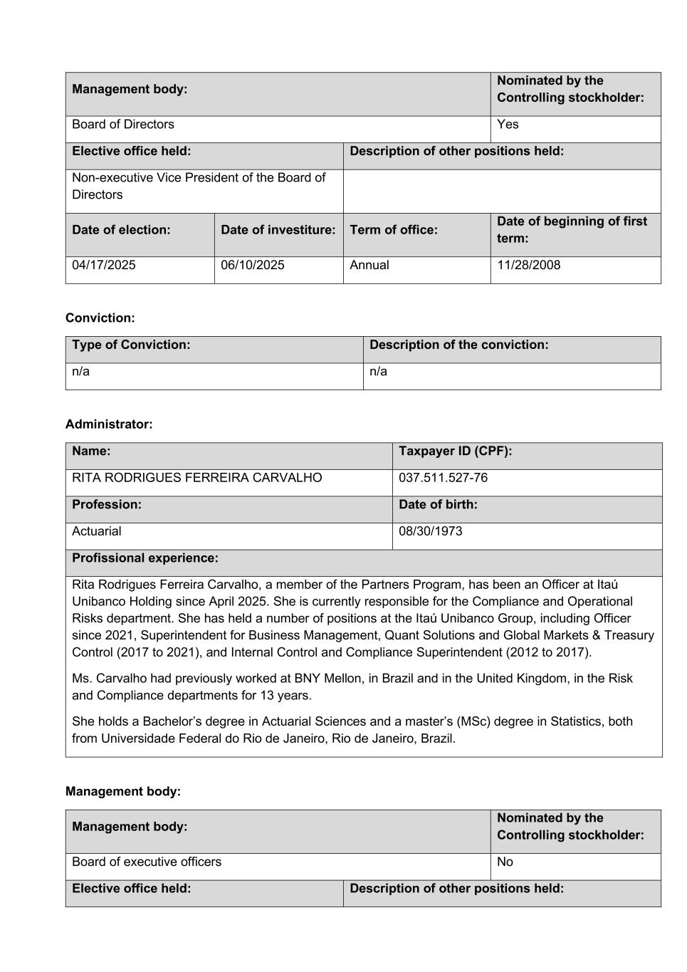 Management body: Nominated by the Controlling stockholder: Board of Directors Yes Elective office held: Description of other positions held: Non-executive Vice President of the Board of Directors Date of election: Date of investiture: Term of office: Date of beginning of first term: 04/17/2025 06/10/2025 Annual 11/28/2008 Conviction: Type of Conviction: Description of the conviction: n/a n/a Administrator: Name: Taxpayer ID (CPF): RITA RODRIGUES FERREIRA CARVALHO 037.511.527-76 Profession: Date of birth: Actuarial 08/30/1973 Profissional experience: Rita Rodrigues Ferreira Carvalho, a member of the Partners Program, has been an Officer at Itaú Unibanco Holding since April 2025. She is currently responsible for the Compliance and Operational Risks department. She has held a number of positions at the Itaú Unibanco Group, including Officer since 2021, Superintendent for Business Management, Quant Solutions and Global Markets & Treasury Control (2017 to 2021), and Internal Control and Compliance Superintendent (2012 to 2017). Ms. Carvalho had previously worked at BNY Mellon, in Brazil and in the United Kingdom, in the Risk and Compliance departments for 13 years. She holds a Bachelor’s degree in Actuarial Sciences and a master’s (MSc) degree in Statistics, both from Universidade Federal do Rio de Janeiro, Rio de Janeiro, Brazil. Management body: Management body: Nominated by the Controlling stockholder: Board of executive officers No Elective office held: Description of other positions held: