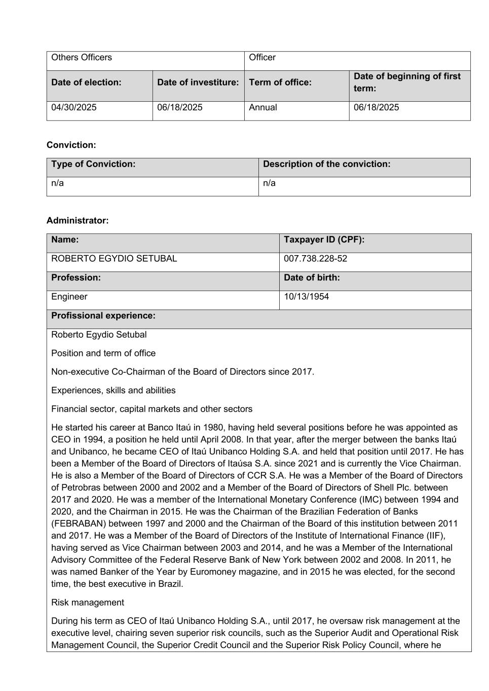 Others Officers Officer Date of election: Date of investiture: Term of office: Date of beginning of first term: 04/30/2025 06/18/2025 Annual 06/18/2025 Conviction: Type of Conviction: Description of the conviction: n/a n/a Administrator: Name: Taxpayer ID (CPF): ROBERTO EGYDIO SETUBAL 007.738.228-52 Profession: Date of birth: Engineer 10/13/1954 Profissional experience: Roberto Egydio Setubal Position and term of office Non-executive Co-Chairman of the Board of Directors since 2017. Experiences, skills and abilities Financial sector, capital markets and other sectors He started his career at Banco Itaú in 1980, having held several positions before he was appointed as CEO in 1994, a position he held until April 2008. In that year, after the merger between the banks Itaú and Unibanco, he became CEO of Itaú Unibanco Holding S.A. and held that position until 2017. He has been a Member of the Board of Directors of Itaúsa S.A. since 2021 and is currently the Vice Chairman. He is also a Member of the Board of Directors of CCR S.A. He was a Member of the Board of Directors of Petrobras between 2000 and 2002 and a Member of the Board of Directors of Shell Plc. between 2017 and 2020. He was a member of the International Monetary Conference (IMC) between 1994 and 2020, and the Chairman in 2015. He was the Chairman of the Brazilian Federation of Banks (FEBRABAN) between 1997 and 2000 and the Chairman of the Board of this institution between 2011 and 2017. He was a Member of the Board of Directors of the Institute of International Finance (IIF), having served as Vice Chairman between 2003 and 2014, and he was a Member of the International Advisory Committee of the Federal Reserve Bank of New York between 2002 and 2008. In 2011, he was named Banker of the Year by Euromoney magazine, and in 2015 he was elected, for the second time, the best executive in Brazil. Risk management During his term as CEO of Itaú Unibanco Holding S.A., until 2017, he oversaw risk management at the executive level, chairing seven superior risk councils, such as the Superior Audit and Operational Risk Management Council, the Superior Credit Council and the Superior Risk Policy Council, where he