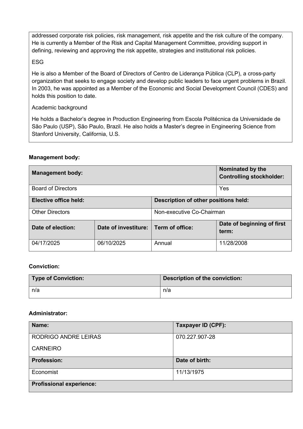 addressed corporate risk policies, risk management, risk appetite and the risk culture of the company. He is currently a Member of the Risk and Capital Management Committee, providing support in defining, reviewing and approving the risk appetite, strategies and institutional risk policies. ESG He is also a Member of the Board of Directors of Centro de Liderança Pública (CLP), a cross-party organization that seeks to engage society and develop public leaders to face urgent problems in Brazil. In 2003, he was appointed as a Member of the Economic and Social Development Council (CDES) and holds this position to date. Academic background He holds a Bachelor’s degree in Production Engineering from Escola Politécnica da Universidade de São Paulo (USP), São Paulo, Brazil. He also holds a Master’s degree in Engineering Science from Stanford University, California, U.S. Management body: Management body: Nominated by the Controlling stockholder: Board of Directors Yes Elective office held: Description of other positions held: Other Directors Non-executive Co-Chairman Date of election: Date of investiture: Term of office: Date of beginning of first term: 04/17/2025 06/10/2025 Annual 11/28/2008 Conviction: Type of Conviction: Description of the conviction: n/a n/a Administrator: Name: Taxpayer ID (CPF): RODRIGO ANDRE LEIRAS CARNEIRO 070.227.907-28 Profession: Date of birth: Economist 11/13/1975 Profissional experience: