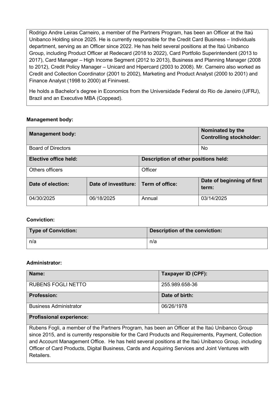 Rodrigo Andre Leiras Carneiro, a member of the Partners Program, has been an Officer at the Itaú Unibanco Holding since 2025. He is currently responsible for the Credit Card Business – Individuals department, serving as an Officer since 2022. He has held several positions at the Itaú Unibanco Group, including Product Officer at Redecard (2018 to 2022), Card Portfolio Superintendent (2013 to 2017), Card Manager – High Income Segment (2012 to 2013), Business and Planning Manager (2008 to 2012), Credit Policy Manager – Unicard and Hipercard (2003 to 2008). Mr. Carneiro also worked as Credit and Collection Coordinator (2001 to 2002), Marketing and Product Analyst (2000 to 2001) and Finance Analyst (1998 to 2000) at Fininvest. He holds a Bachelor’s degree in Economics from the Universidade Federal do Rio de Janeiro (UFRJ), Brazil and an Executive MBA (Coppead). Management body: Management body: Nominated by the Controlling stockholder: Board of Directors No Elective office held: Description of other positions held: Others officers Officer Date of election: Date of investiture: Term of office: Date of beginning of first term: 04/30/2025 06/18/2025 Annual 03/14/2025 Conviction: Type of Conviction: Description of the conviction: n/a n/a Administrator: Name: Taxpayer ID (CPF): RUBENS FOGLI NETTO 255.989.658-36 Profession: Date of birth: Business Administrator 06/26/1978 Profissional experience: Rubens Fogli, a member of the Partners Program, has been an Officer at the Itaú Unibanco Group since 2015, and is currently responsible for the Card Products and Requirements, Payment, Collection and Account Management Office. He has held several positions at the Itaú Unibanco Group, including Officer of Card Products, Digital Business, Cards and Acquiring Services and Joint Ventures with Retailers.