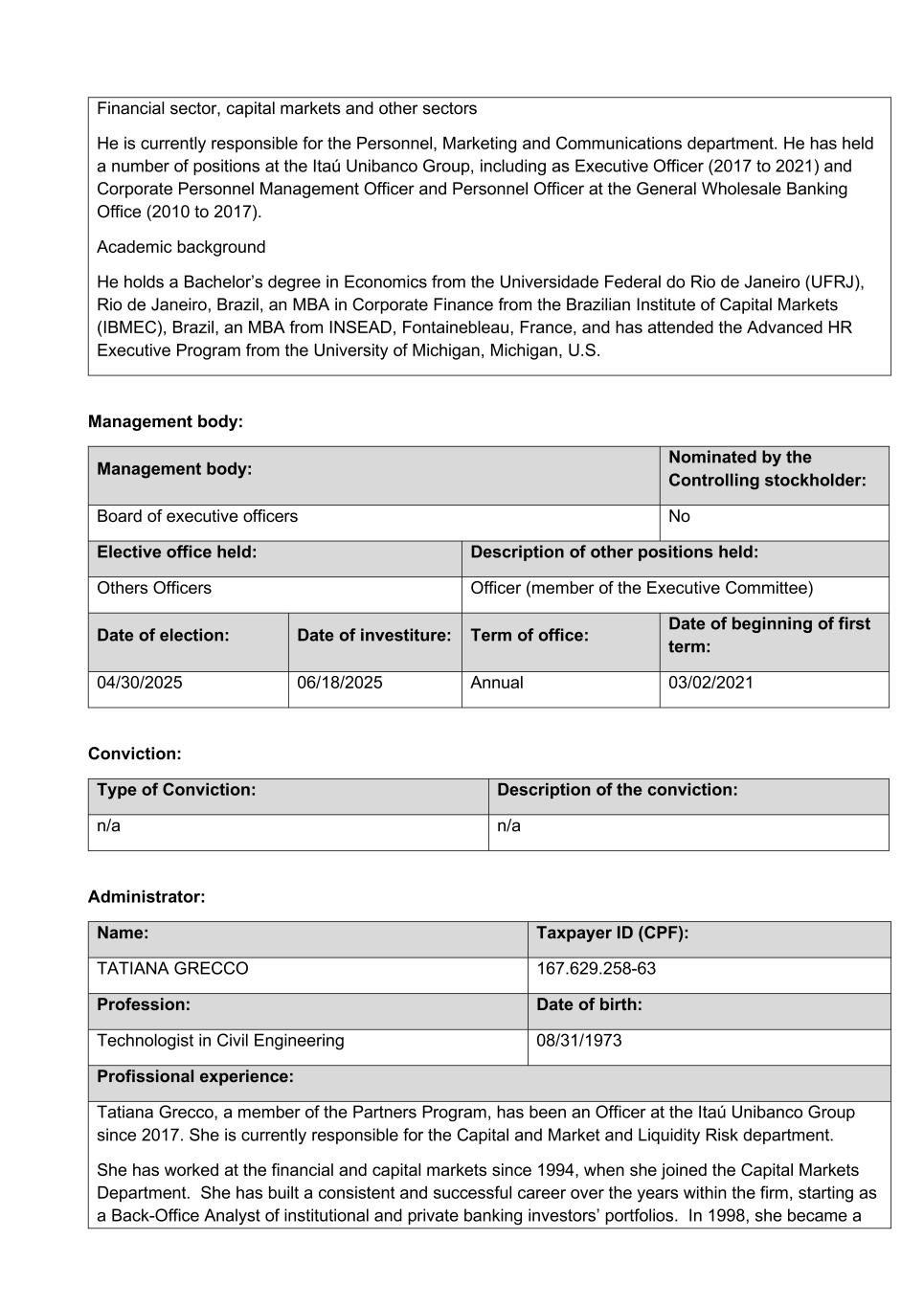 Financial sector, capital markets and other sectors He is currently responsible for the Personnel, Marketing and Communications department. He has held a number of positions at the Itaú Unibanco Group, including as Executive Officer (2017 to 2021) and Corporate Personnel Management Officer and Personnel Officer at the General Wholesale Banking Office (2010 to 2017). Academic background He holds a Bachelor’s degree in Economics from the Universidade Federal do Rio de Janeiro (UFRJ), Rio de Janeiro, Brazil, an MBA in Corporate Finance from the Brazilian Institute of Capital Markets (IBMEC), Brazil, an MBA from INSEAD, Fontainebleau, France, and has attended the Advanced HR Executive Program from the University of Michigan, Michigan, U.S. Management body: Management body: Nominated by the Controlling stockholder: Board of executive officers No Elective office held: Description of other positions held: Others Officers Officer (member of the Executive Committee) Date of election: Date of investiture: Term of office: Date of beginning of first term: 04/30/2025 06/18/2025 Annual 03/02/2021 Conviction: Type of Conviction: Description of the conviction: n/a n/a Administrator: Name: Taxpayer ID (CPF): TATIANA GRECCO 167.629.258-63 Profession: Date of birth: Technologist in Civil Engineering 08/31/1973 Profissional experience: Tatiana Grecco, a member of the Partners Program, has been an Officer at the Itaú Unibanco Group since 2017. She is currently responsible for the Capital and Market and Liquidity Risk department. She has worked at the financial and capital markets since 1994, when she joined the Capital Markets Department. She has built a consistent and successful career over the years within the firm, starting as a Back-Office Analyst of institutional and private banking investors’ portfolios. In 1998, she became a
