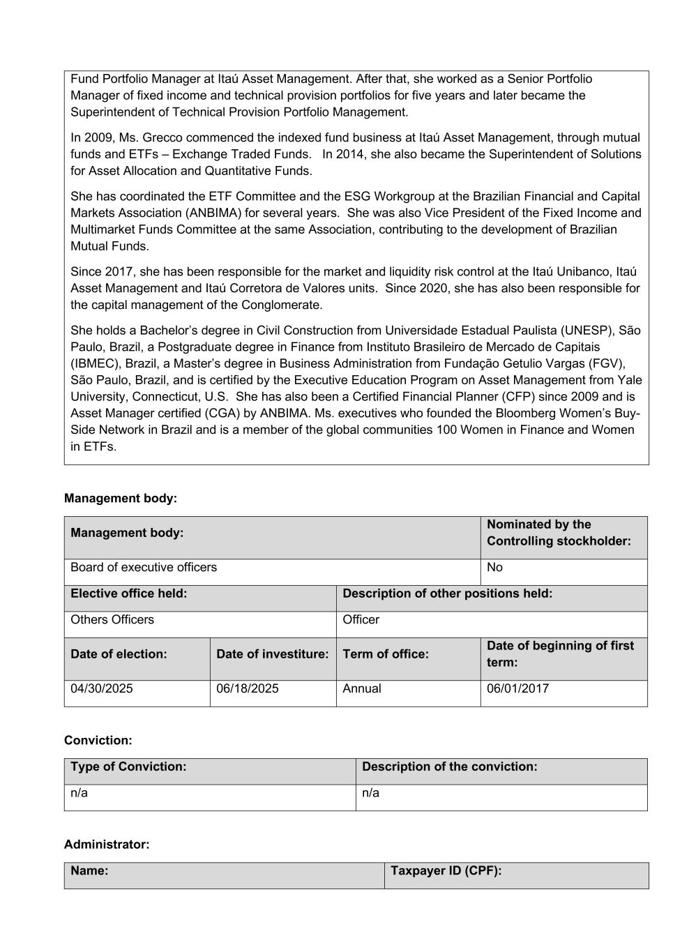 Fund Portfolio Manager at Itaú Asset Management. After that, she worked as a Senior Portfolio Manager of fixed income and technical provision portfolios for five years and later became the Superintendent of Technical Provision Portfolio Management. In 2009, Ms. Grecco commenced the indexed fund business at Itaú Asset Management, through mutual funds and ETFs – Exchange Traded Funds. In 2014, she also became the Superintendent of Solutions for Asset Allocation and Quantitative Funds. She has coordinated the ETF Committee and the ESG Workgroup at the Brazilian Financial and Capital Markets Association (ANBIMA) for several years. She was also Vice President of the Fixed Income and Multimarket Funds Committee at the same Association, contributing to the development of Brazilian Mutual Funds. Since 2017, she has been responsible for the market and liquidity risk control at the Itaú Unibanco, Itaú Asset Management and Itaú Corretora de Valores units. Since 2020, she has also been responsible for the capital management of the Conglomerate. She holds a Bachelor’s degree in Civil Construction from Universidade Estadual Paulista (UNESP), São Paulo, Brazil, a Postgraduate degree in Finance from Instituto Brasileiro de Mercado de Capitais (IBMEC), Brazil, a Master’s degree in Business Administration from Fundação Getulio Vargas (FGV), São Paulo, Brazil, and is certified by the Executive Education Program on Asset Management from Yale University, Connecticut, U.S. She has also been a Certified Financial Planner (CFP) since 2009 and is Asset Manager certified (CGA) by ANBIMA. Ms. executives who founded the Bloomberg Women’s Buy- Side Network in Brazil and is a member of the global communities 100 Women in Finance and Women in ETFs. Management body: Management body: Nominated by the Controlling stockholder: Board of executive officers No Elective office held: Description of other positions held: Others Officers Officer Date of election: Date of investiture: Term of office: Date of beginning of first term: 04/30/2025 06/18/2025 Annual 06/01/2017 Conviction: Type of Conviction: Description of the conviction: n/a n/a Administrator: Name: Taxpayer ID (CPF):