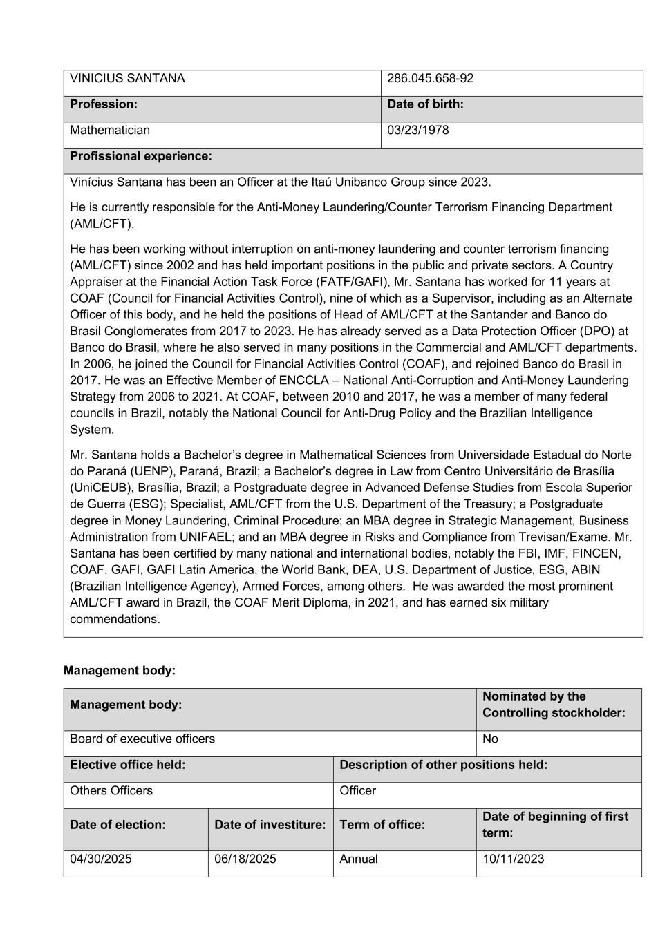 VINICIUS SANTANA 286.045.658-92 Profession: Date of birth: Mathematician 03/23/1978 Profissional experience: Vinícius Santana has been an Officer at the Itaú Unibanco Group since 2023. He is currently responsible for the Anti-Money Laundering/Counter Terrorism Financing Department (AML/CFT). He has been working without interruption on anti-money laundering and counter terrorism financing (AML/CFT) since 2002 and has held important positions in the public and private sectors. A Country Appraiser at the Financial Action Task Force (FATF/GAFI), Mr. Santana has worked for 11 years at COAF (Council for Financial Activities Control), nine of which as a Supervisor, including as an Alternate Officer of this body, and he held the positions of Head of AML/CFT at the Santander and Banco do Brasil Conglomerates from 2017 to 2023. He has already served as a Data Protection Officer (DPO) at Banco do Brasil, where he also served in many positions in the Commercial and AML/CFT departments. In 2006, he joined the Council for Financial Activities Control (COAF), and rejoined Banco do Brasil in 2017. He was an Effective Member of ENCCLA – National Anti-Corruption and Anti-Money Laundering Strategy from 2006 to 2021. At COAF, between 2010 and 2017, he was a member of many federal councils in Brazil, notably the National Council for Anti-Drug Policy and the Brazilian Intelligence System. Mr. Santana holds a Bachelor’s degree in Mathematical Sciences from Universidade Estadual do Norte do Paraná (UENP), Paraná, Brazil; a Bachelor’s degree in Law from Centro Universitário de Brasília (UniCEUB), Brasília, Brazil; a Postgraduate degree in Advanced Defense Studies from Escola Superior de Guerra (ESG); Specialist, AML/CFT from the U.S. Department of the Treasury; a Postgraduate degree in Money Laundering, Criminal Procedure; an MBA degree in Strategic Management, Business Administration from UNIFAEL; and an MBA degree in Risks and Compliance from Trevisan/Exame. Mr. Santana has been certified by many national and international bodies, notably the FBI, IMF, FINCEN, COAF, GAFI, GAFI Latin America, the World Bank, DEA, U.S. Department of Justice, ESG, ABIN (Brazilian Intelligence Agency), Armed Forces, among others. He was awarded the most prominent AML/CFT award in Brazil, the COAF Merit Diploma, in 2021, and has earned six military commendations. Management body: Management body: Nominated by the Controlling stockholder: Board of executive officers No Elective office held: Description of other positions held: Others Officers Officer Date of election: Date of investiture: Term of office: Date of beginning of first term: 04/30/2025 06/18/2025 Annual 10/11/2023