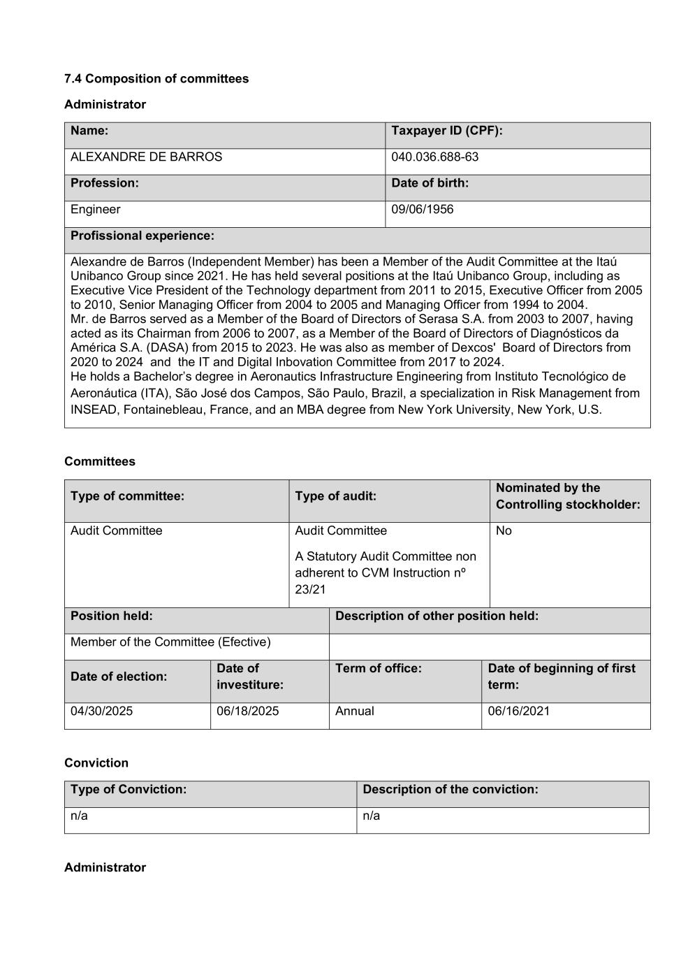 7.4 Composition of committees Administrator Name: Taxpayer ID (CPF): ALEXANDRE DE BARROS 040.036.688-63 Profession: Date of birth: Engineer 09/06/1956 Profissional experience: Alexandre de Barros (Independent Member) has been a Member of the Audit Committee at the Itaú Unibanco Group since 2021. He has held several positions at the Itaú Unibanco Group, including as Executive Vice President of the Technology department from 2011 to 2015, Executive Officer from 2005 to 2010, Senior Managing Officer from 2004 to 2005 and Managing Officer from 1994 to 2004. Mr. de Barros served as a Member of the Board of Directors of Serasa S.A. from 2003 to 2007, having acted as its Chairman from 2006 to 2007, as a Member of the Board of Directors of Diagnósticos da América S.A. (DASA) from 2015 to 2023. He was also as member of Dexcos' Board of Directors from 2020 to 2024 and the IT and Digital Inbovation Committee from 2017 to 2024. He holds a Bachelor’s degree in Aeronautics Infrastructure Engineering from Instituto Tecnológico de Aeronáutica (ITA), São José dos Campos, São Paulo, Brazil, a specialization in Risk Management from INSEAD, Fontainebleau, France, and an MBA degree from New York University, New York, U.S. Committees Type of committee: Type of audit: Nominated by the Controlling stockholder: Audit Committee Audit Committee A Statutory Audit Committee non adherent to CVM Instruction nº 23/21 No Position held: Description of other position held: Member of the Committee (Efective) Date of election: Date of investiture: Term of office: Date of beginning of first term: 04/30/2025 06/18/2025 Annual 06/16/2021 Conviction Type of Conviction: Description of the conviction: n/a n/a Administrator