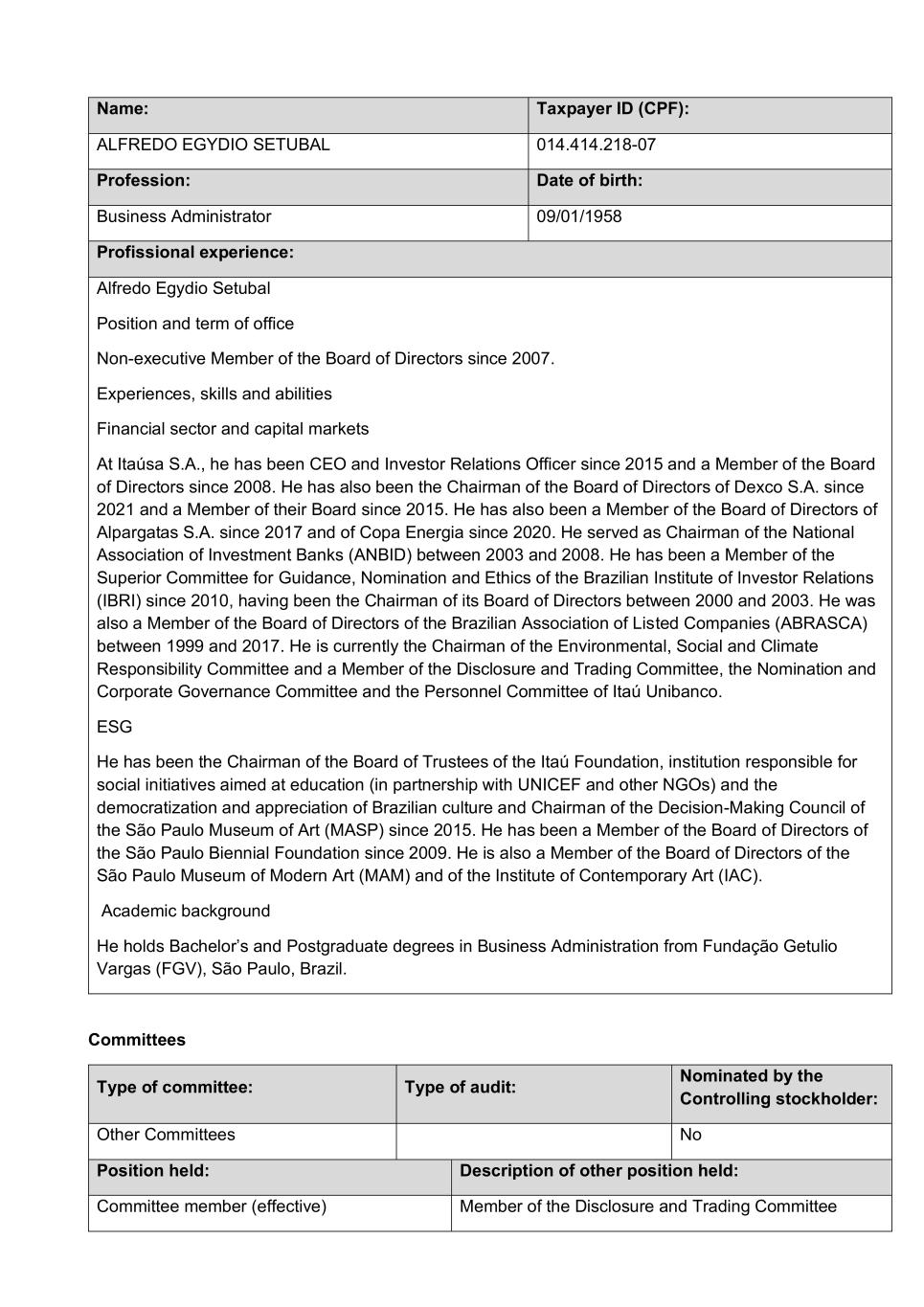 Name: Taxpayer ID (CPF): ALFREDO EGYDIO SETUBAL 014.414.218-07 Profession: Date of birth: Business Administrator 09/01/1958 Profissional experience: Alfredo Egydio Setubal Position and term of office Non-executive Member of the Board of Directors since 2007. Experiences, skills and abilities Financial sector and capital markets At Itaúsa S.A., he has been CEO and Investor Relations Officer since 2015 and a Member of the Board of Directors since 2008. He has also been the Chairman of the Board of Directors of Dexco S.A. since 2021 and a Member of their Board since 2015. He has also been a Member of the Board of Directors of Alpargatas S.A. since 2017 and of Copa Energia since 2020. He served as Chairman of the National Association of Investment Banks (ANBID) between 2003 and 2008. He has been a Member of the Superior Committee for Guidance, Nomination and Ethics of the Brazilian Institute of Investor Relations (IBRI) since 2010, having been the Chairman of its Board of Directors between 2000 and 2003. He was also a Member of the Board of Directors of the Brazilian Association of Listed Companies (ABRASCA) between 1999 and 2017. He is currently the Chairman of the Environmental, Social and Climate Responsibility Committee and a Member of the Disclosure and Trading Committee, the Nomination and Corporate Governance Committee and the Personnel Committee of Itaú Unibanco. ESG He has been the Chairman of the Board of Trustees of the Itaú Foundation, institution responsible for social initiatives aimed at education (in partnership with UNICEF and other NGOs) and the democratization and appreciation of Brazilian culture and Chairman of the Decision-Making Council of the São Paulo Museum of Art (MASP) since 2015. He has been a Member of the Board of Directors of the São Paulo Biennial Foundation since 2009. He is also a Member of the Board of Directors of the São Paulo Museum of Modern Art (MAM) and of the Institute of Contemporary Art (IAC). Academic background He holds Bachelor’s and Postgraduate degrees in Business Administration from Fundação Getulio Vargas (FGV), São Paulo, Brazil. Committees Type of committee: Type of audit: Nominated by the Controlling stockholder: Other Committees No Position held: Description of other position held: Committee member (effective) Member of the Disclosure and Trading Committee