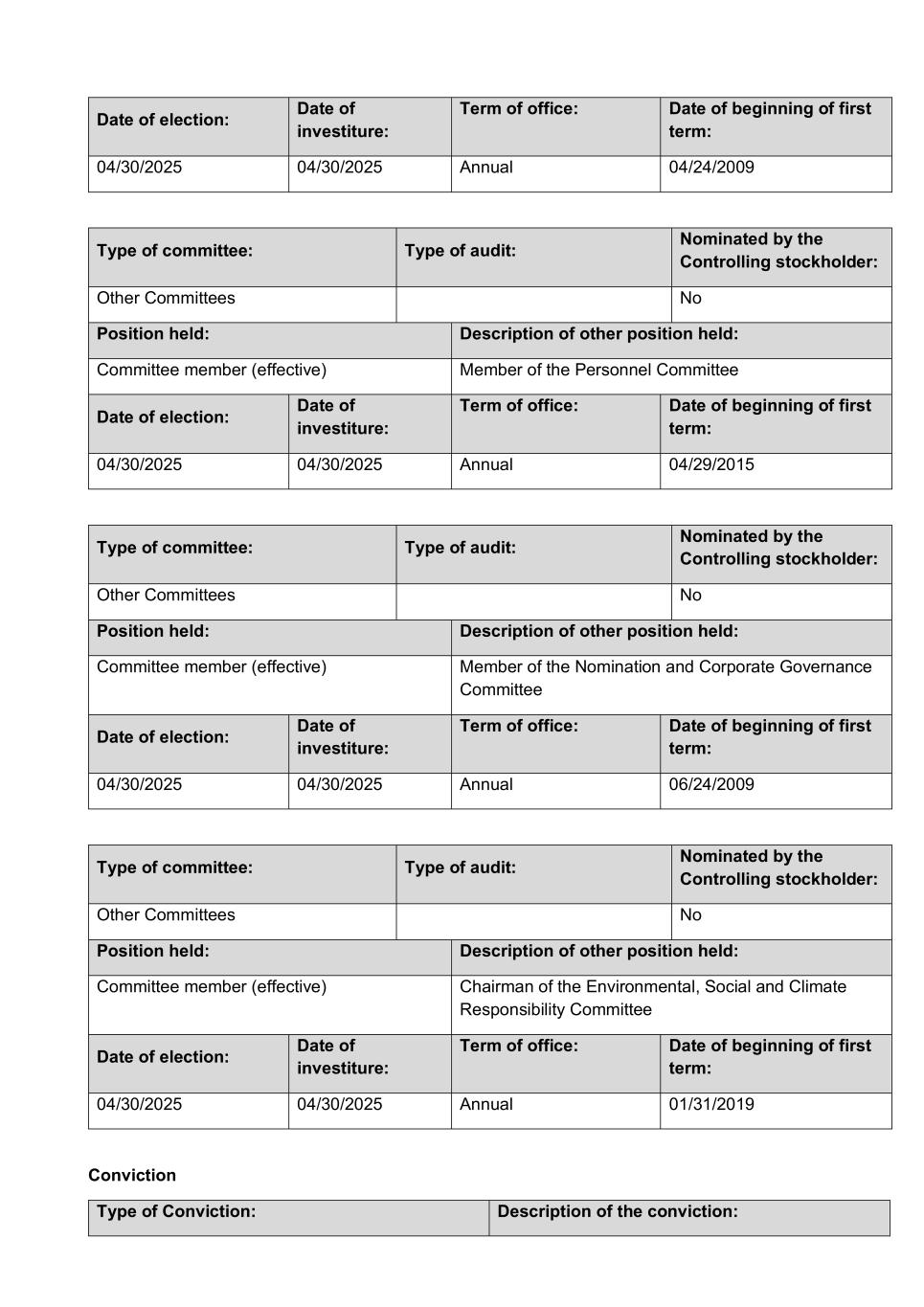Date of election: Date of investiture: Term of office: Date of beginning of first term: 04/30/2025 04/30/2025 Annual 04/24/2009 Type of committee: Type of audit: Nominated by the Controlling stockholder: Other Committees No Position held: Description of other position held: Committee member (effective) Member of the Personnel Committee Date of election: Date of investiture: Term of office: Date of beginning of first term: 04/30/2025 04/30/2025 Annual 04/29/2015 Type of committee: Type of audit: Nominated by the Controlling stockholder: Other Committees No Position held: Description of other position held: Committee member (effective) Member of the Nomination and Corporate Governance Committee Date of election: Date of investiture: Term of office: Date of beginning of first term: 04/30/2025 04/30/2025 Annual 06/24/2009 Type of committee: Type of audit: Nominated by the Controlling stockholder: Other Committees No Position held: Description of other position held: Committee member (effective) Chairman of the Environmental, Social and Climate Responsibility Committee Date of election: Date of investiture: Term of office: Date of beginning of first term: 04/30/2025 04/30/2025 Annual 01/31/2019 Conviction Type of Conviction: Description of the conviction: