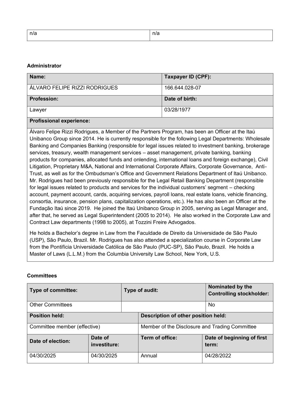 n/a n/a Administrator Name: Taxpayer ID (CPF): ÁLVARO FELIPE RIZZI RODRIGUES 166.644.028-07 Profession: Date of birth: Lawyer 03/28/1977 Profissional experience: Álvaro Felipe Rizzi Rodrigues, a Member of the Partners Program, has been an Officer at the Itaú Unibanco Group since 2014. He is currently responsible for the following Legal Departments: Wholesale Banking and Companies Banking (responsible for legal issues related to investment banking, brokerage services, treasury, wealth management services – asset management, private banking, banking products for companies, allocated funds and onlending, international loans and foreign exchange), Civil Litigation, Proprietary M&A, National and International Corporate Affairs, Corporate Governance, Anti- Trust, as well as for the Ombudsman’s Office and Government Relations Department of Itaú Unibanco. Mr. Rodrigues had been previously responsible for the Legal Retail Banking Department (responsible for legal issues related to products and services for the individual customers’ segment – checking account, payment account, cards, acquiring services, payroll loans, real estate loans, vehicle financing, consortia, insurance, pension plans, capitalization operations, etc.). He has also been an Officer at the Fundação Itaú since 2019. He joined the Itaú Unibanco Group in 2005, serving as Legal Manager and, after that, he served as Legal Superintendent (2005 to 2014). He also worked in the Corporate Law and Contract Law departments (1998 to 2005), at Tozzini Freire Advogados. He holds a Bachelor’s degree in Law from the Faculdade de Direito da Universidade de São Paulo (USP), São Paulo, Brazil. Mr. Rodrigues has also attended a specialization course in Corporate Law from the Pontifícia Universidade Católica de São Paulo (PUC-SP), São Paulo, Brazil. He holds a Master of Laws (L.L.M.) from the Columbia University Law School, New York, U.S. Committees Type of committee: Type of audit: Nominated by the Controlling stockholder: Other Committees No Position held: Description of other position held: Committee member (effective) Member of the Disclosure and Trading Committee Date of election: Date of investiture: Term of office: Date of beginning of first term: 04/30/2025 04/30/2025 Annual 04/28/2022