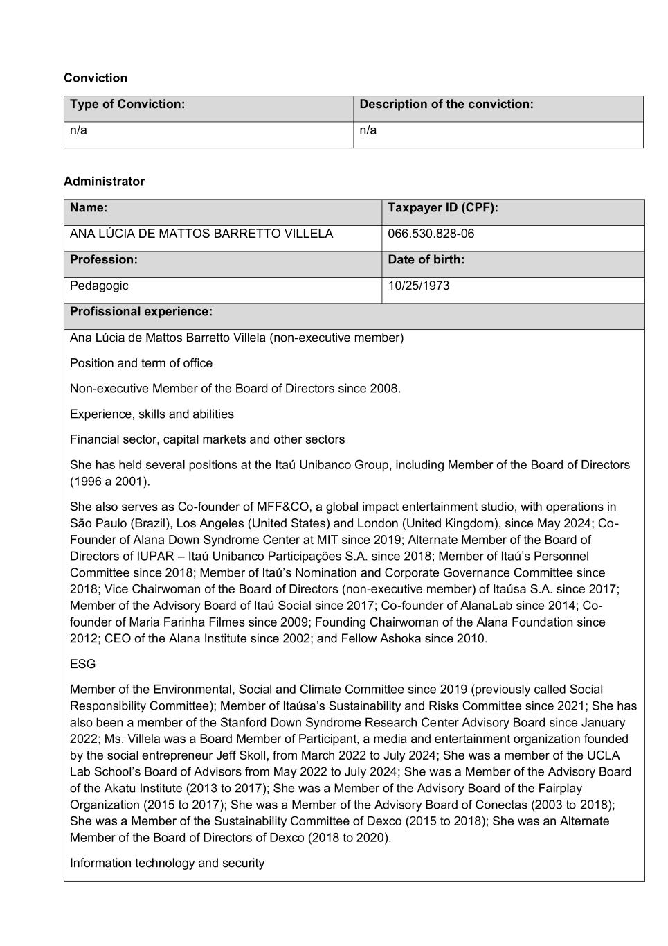 Conviction Type of Conviction: Description of the conviction: n/a n/a Administrator Name: Taxpayer ID (CPF): ANA LÚCIA DE MATTOS BARRETTO VILLELA 066.530.828-06 Profession: Date of birth: Pedagogic 10/25/1973 Profissional experience: Ana Lúcia de Mattos Barretto Villela (non-executive member) Position and term of office Non-executive Member of the Board of Directors since 2008. Experience, skills and abilities Financial sector, capital markets and other sectors She has held several positions at the Itaú Unibanco Group, including Member of the Board of Directors (1996 a 2001). She also serves as Co-founder of MFF&CO, a global impact entertainment studio, with operations in São Paulo (Brazil), Los Angeles (United States) and London (United Kingdom), since May 2024; Co- Founder of Alana Down Syndrome Center at MIT since 2019; Alternate Member of the Board of Directors of IUPAR – Itaú Unibanco Participações S.A. since 2018; Member of Itaú’s Personnel Committee since 2018; Member of Itaú’s Nomination and Corporate Governance Committee since 2018; Vice Chairwoman of the Board of Directors (non-executive member) of Itaúsa S.A. since 2017; Member of the Advisory Board of Itaú Social since 2017; Co-founder of AlanaLab since 2014; Co- founder of Maria Farinha Filmes since 2009; Founding Chairwoman of the Alana Foundation since 2012; CEO of the Alana Institute since 2002; and Fellow Ashoka since 2010. ESG Member of the Environmental, Social and Climate Committee since 2019 (previously called Social Responsibility Committee); Member of Itaúsa’s Sustainability and Risks Committee since 2021; She has also been a member of the Stanford Down Syndrome Research Center Advisory Board since January 2022; Ms. Villela was a Board Member of Participant, a media and entertainment organization founded by the social entrepreneur Jeff Skoll, from March 2022 to July 2024; She was a member of the UCLA Lab School’s Board of Advisors from May 2022 to July 2024; She was a Member of the Advisory Board of the Akatu Institute (2013 to 2017); She was a Member of the Advisory Board of the Fairplay Organization (2015 to 2017); She was a Member of the Advisory Board of Conectas (2003 to 2018); She was a Member of the Sustainability Committee of Dexco (2015 to 2018); She was an Alternate Member of the Board of Directors of Dexco (2018 to 2020). Information technology and security