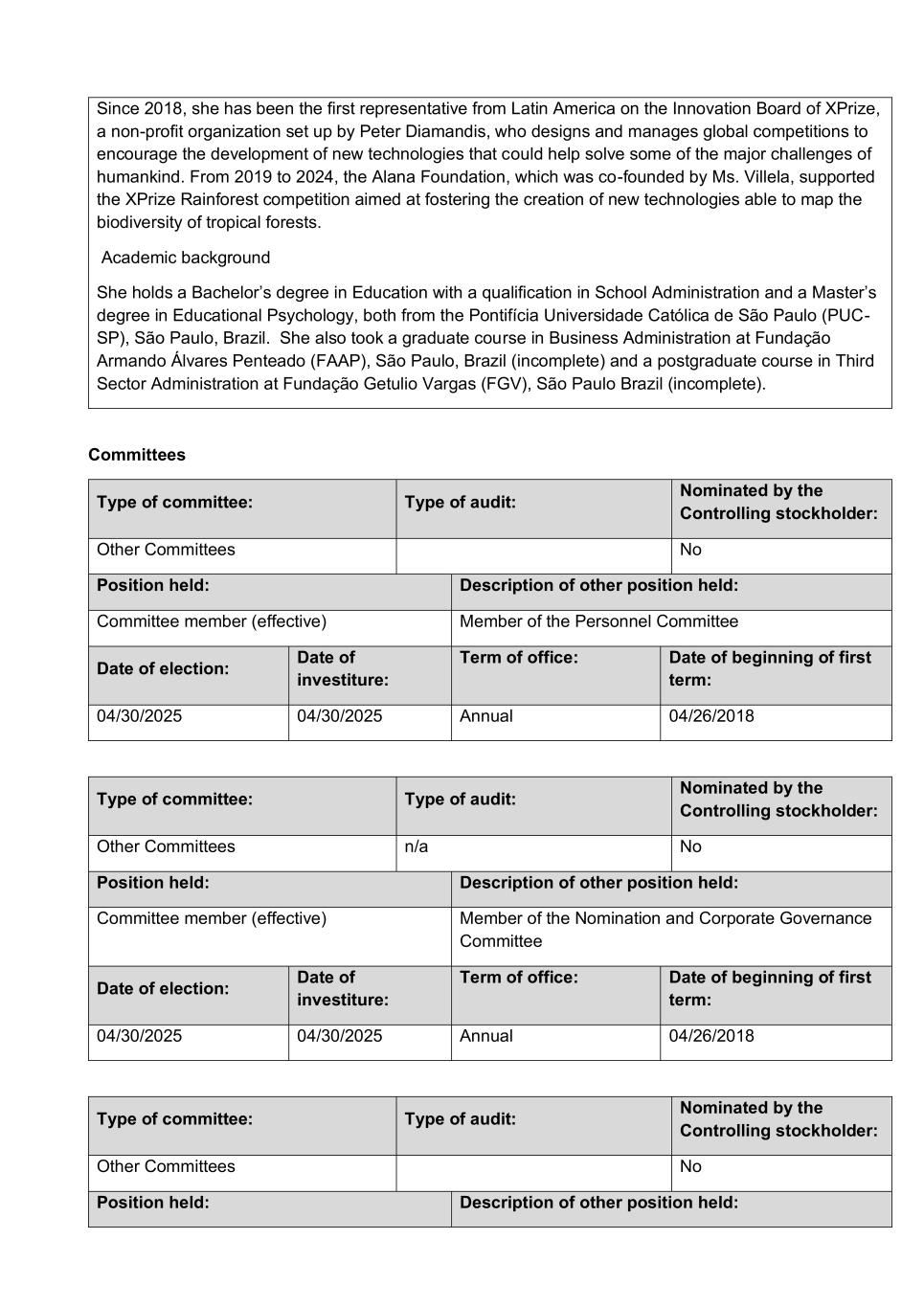 Since 2018, she has been the first representative from Latin America on the Innovation Board of XPrize, a non-profit organization set up by Peter Diamandis, who designs and manages global competitions to encourage the development of new technologies that could help solve some of the major challenges of humankind. From 2019 to 2024, the Alana Foundation, which was co-founded by Ms. Villela, supported the XPrize Rainforest competition aimed at fostering the creation of new technologies able to map the biodiversity of tropical forests. Academic background She holds a Bachelor’s degree in Education with a qualification in School Administration and a Master’s degree in Educational Psychology, both from the Pontifícia Universidade Católica de São Paulo (PUC- SP), São Paulo, Brazil. She also took a graduate course in Business Administration at Fundação Armando Álvares Penteado (FAAP), São Paulo, Brazil (incomplete) and a postgraduate course in Third Sector Administration at Fundação Getulio Vargas (FGV), São Paulo Brazil (incomplete). Committees Type of committee: Type of audit: Nominated by the Controlling stockholder: Other Committees No Position held: Description of other position held: Committee member (effective) Member of the Personnel Committee Date of election: Date of investiture: Term of office: Date of beginning of first term: 04/30/2025 04/30/2025 Annual 04/26/2018 Type of committee: Type of audit: Nominated by the Controlling stockholder: Other Committees n/a No Position held: Description of other position held: Committee member (effective) Member of the Nomination and Corporate Governance Committee Date of election: Date of investiture: Term of office: Date of beginning of first term: 04/30/2025 04/30/2025 Annual 04/26/2018 Type of committee: Type of audit: Nominated by the Controlling stockholder: Other Committees No Position held: Description of other position held: