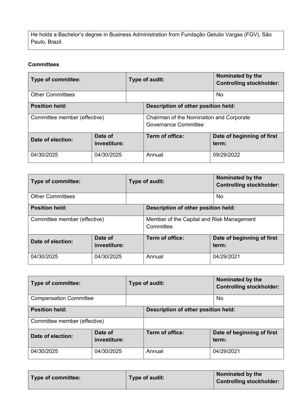 He holds a Bachelor’s degree in Business Administration from Fundação Getulio Vargas (FGV), São Paulo, Brazil. Committees Type of committee: Type of audit: Nominated by the Controlling stockholder: Other Committees No Position held: Description of other position held: Committee member (effective) Chairman of the Nomination and Corporate Governance Committee Date of election: Date of investiture: Term of office: Date of beginning of first term: 04/30/2025 04/30/2025 Annual 09/29/2022 Type of committee: Type of audit: Nominated by the Controlling stockholder: Other Committees No Position held: Description of other position held: Committee member (effective) Member of the Capital and Risk Management Committee Date of election: Date of investiture: Term of office: Date of beginning of first term: 04/30/2025 04/30/2025 Annual 04/29/2021 Type of committee: Type of audit: Nominated by the Controlling stockholder: Compensation Committee No Position held: Description of other position held: Committee member (effective) Date of election: Date of investiture: Term of office: Date of beginning of first term: 04/30/2025 04/30/2025 Annual 04/29/2021 Type of committee: Type of audit: Nominated by the Controlling stockholder: