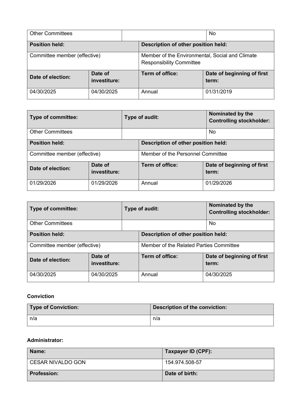 Other Committees No Position held: Description of other position held: Committee member (effective) Member of the Environmental, Social and Climate Responsibility Committee Date of election: Date of investiture: Term of office: Date of beginning of first term: 04/30/2025 04/30/2025 Annual 01/31/2019 Type of committee: Type of audit: Nominated by the Controlling stockholder: Other Committees No Position held: Description of other position held: Committee member (effective) Member of the Personnel Committee Date of election: Date of investiture: Term of office: Date of beginning of first term: 01/29/2026 01/29/2026 Annual 01/29/2026 Type of committee: Type of audit: Nominated by the Controlling stockholder: Other Committees No Position held: Description of other position held: Committee member (effective) Member of the Related Parties Committee Date of election: Date of investiture: Term of office: Date of beginning of first term: 04/30/2025 04/30/2025 Annual 04/30/2025 Conviction Type of Conviction: Description of the conviction: n/a n/a Administrator: Name: Taxpayer ID (CPF): CESAR NIVALDO GON 154.974.508-57 Profession: Date of birth: