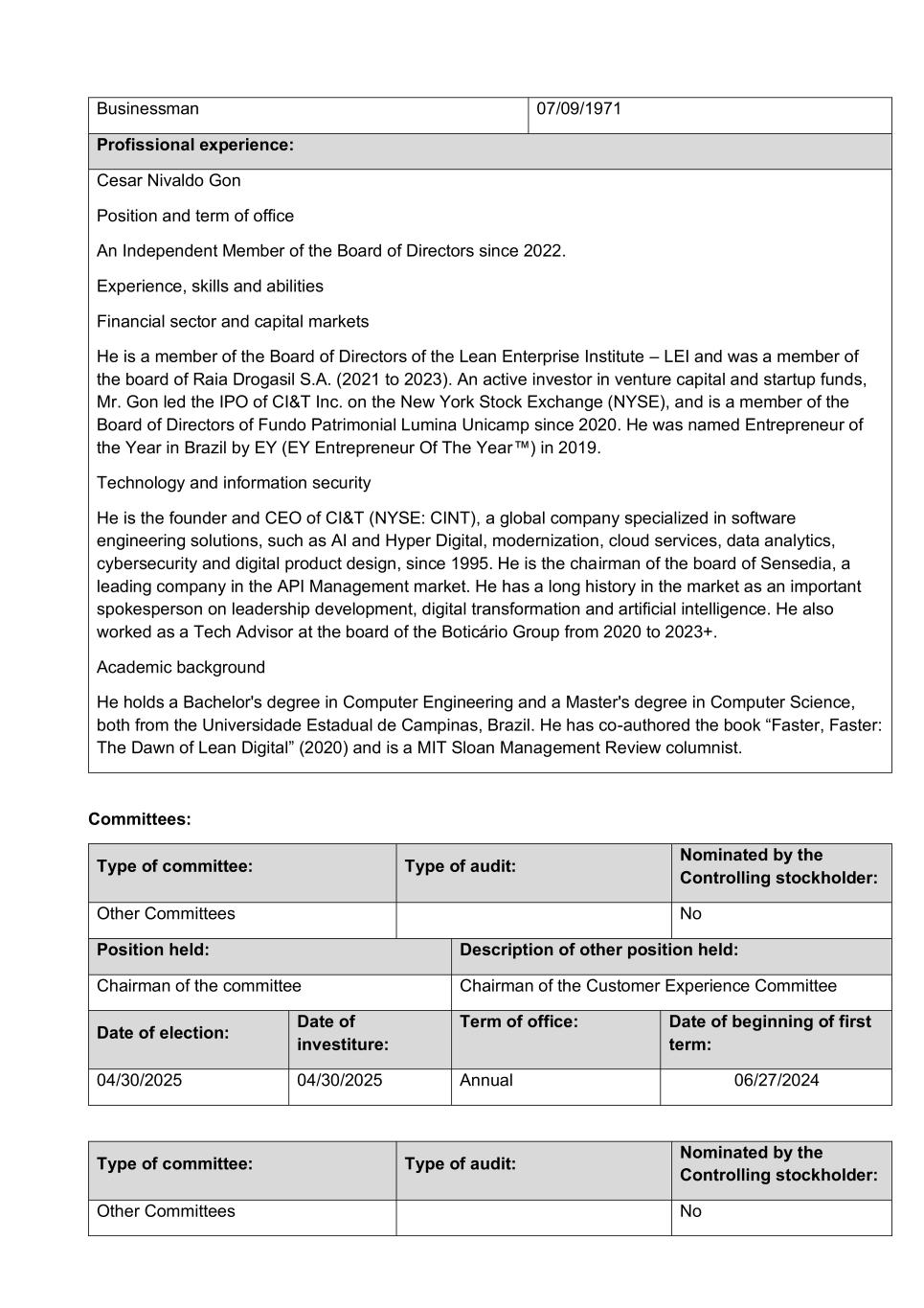 Businessman 07/09/1971 Profissional experience: Cesar Nivaldo Gon Position and term of office An Independent Member of the Board of Directors since 2022. Experience, skills and abilities Financial sector and capital markets He is a member of the Board of Directors of the Lean Enterprise Institute – LEI and was a member of the board of Raia Drogasil S.A. (2021 to 2023). An active investor in venture capital and startup funds, Mr. Gon led the IPO of CI&T Inc. on the New York Stock Exchange (NYSE), and is a member of the Board of Directors of Fundo Patrimonial Lumina Unicamp since 2020. He was named Entrepreneur of the Year in Brazil by EY (EY Entrepreneur Of The Year™) in 2019. Technology and information security He is the founder and CEO of CI&T (NYSE: CINT), a global company specialized in software engineering solutions, such as AI and Hyper Digital, modernization, cloud services, data analytics, cybersecurity and digital product design, since 1995. He is the chairman of the board of Sensedia, a leading company in the API Management market. He has a long history in the market as an important spokesperson on leadership development, digital transformation and artificial intelligence. He also worked as a Tech Advisor at the board of the Boticário Group from 2020 to 2023+. Academic background He holds a Bachelor's degree in Computer Engineering and a Master's degree in Computer Science, both from the Universidade Estadual de Campinas, Brazil. He has co-authored the book “Faster, Faster: The Dawn of Lean Digital” (2020) and is a MIT Sloan Management Review columnist. Committees: Type of committee: Type of audit: Nominated by the Controlling stockholder: Other Committees No Position held: Description of other position held: Chairman of the committee Chairman of the Customer Experience Committee Date of election: Date of investiture: Term of office: Date of beginning of first term: 04/30/2025 04/30/2025 Annual 06/27/2024 Type of committee: Type of audit: Nominated by the Controlling stockholder: Other Committees No