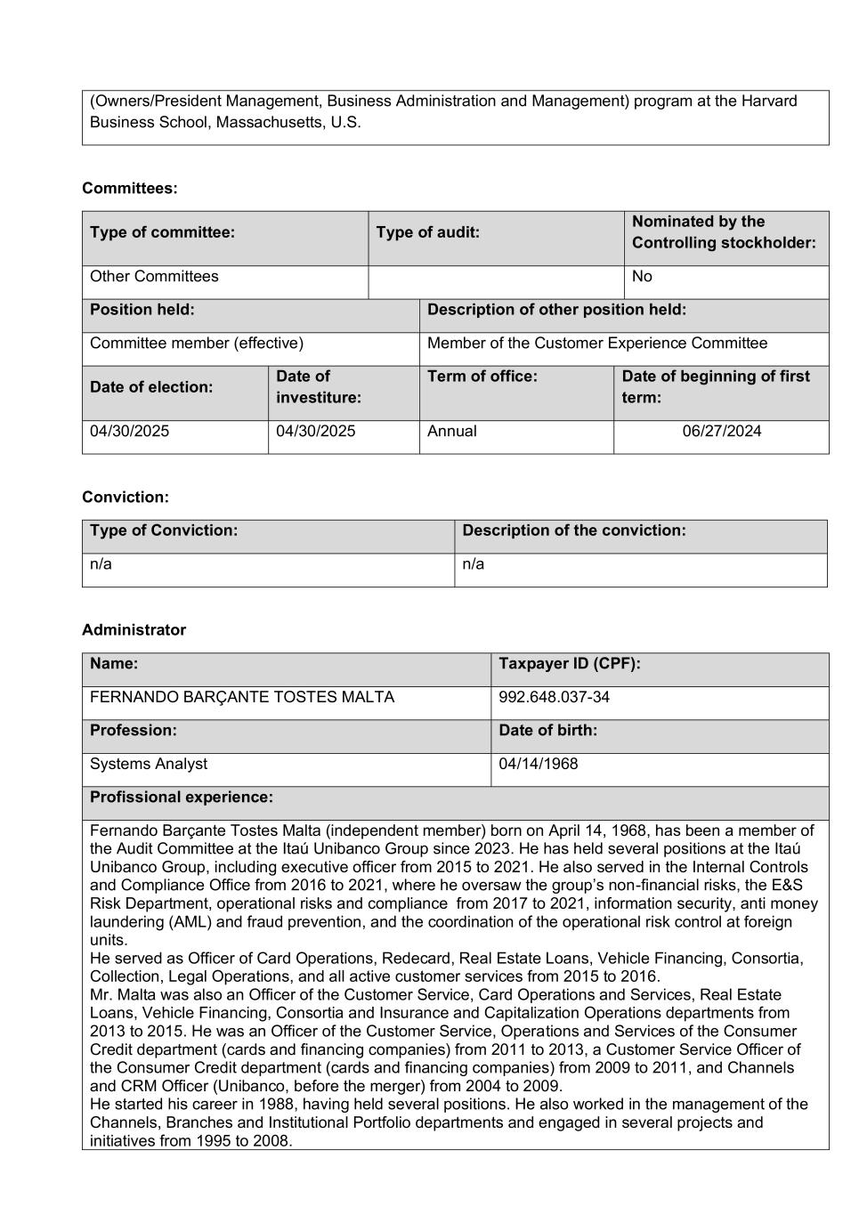 (Owners/President Management, Business Administration and Management) program at the Harvard Business School, Massachusetts, U.S. Committees: Type of committee: Type of audit: Nominated by the Controlling stockholder: Other Committees No Position held: Description of other position held: Committee member (effective) Member of the Customer Experience Committee Date of election: Date of investiture: Term of office: Date of beginning of first term: 04/30/2025 04/30/2025 Annual 06/27/2024 Conviction: Type of Conviction: Description of the conviction: n/a n/a Administrator Name: Taxpayer ID (CPF): FERNANDO BARÇANTE TOSTES MALTA 992.648.037-34 Profession: Date of birth: Systems Analyst 04/14/1968 Profissional experience: Fernando Barçante Tostes Malta (independent member) born on April 14, 1968, has been a member of the Audit Committee at the Itaú Unibanco Group since 2023. He has held several positions at the Itaú Unibanco Group, including executive officer from 2015 to 2021. He also served in the Internal Controls and Compliance Office from 2016 to 2021, where he oversaw the group’s non-financial risks, the E&S Risk Department, operational risks and compliance from 2017 to 2021, information security, anti money laundering (AML) and fraud prevention, and the coordination of the operational risk control at foreign units. He served as Officer of Card Operations, Redecard, Real Estate Loans, Vehicle Financing, Consortia, Collection, Legal Operations, and all active customer services from 2015 to 2016. Mr. Malta was also an Officer of the Customer Service, Card Operations and Services, Real Estate Loans, Vehicle Financing, Consortia and Insurance and Capitalization Operations departments from 2013 to 2015. He was an Officer of the Customer Service, Operations and Services of the Consumer Credit department (cards and financing companies) from 2011 to 2013, a Customer Service Officer of the Consumer Credit department (cards and financing companies) from 2009 to 2011, and Channels and CRM Officer (Unibanco, before the merger) from 2004 to 2009. He started his career in 1988, having held several positions. He also worked in the management of the Channels, Branches and Institutional Portfolio departments and engaged in several projects and initiatives from 1995 to 2008.
