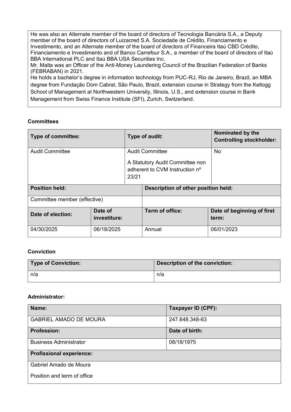 He was also an Alternate member of the board of directors of Tecnologia Bancária S.A., a Deputy member of the board of directors of Luizacred S.A. Sociedade de Crédito, Financiamento e Investimento, and an Alternate member of the board of directors of Financeira Itaú CBD Crédito, Financiamento e Investimento and of Banco Carrefour S.A., a member of the board of directors of Itaú BBA International PLC and Itaú BBA USA Securities Inc. Mr. Malta was an Officer of the Anti-Money Laundering Council of the Brazilian Federation of Banks (FEBRABAN) in 2021. He holds a bachelor’s degree in information technology from PUC-RJ, Rio de Janeiro, Brazil, an MBA degree from Fundação Dom Cabral, São Paulo, Brazil, extension course in Strategy from the Kellogg School of Management at Northwestern University, Illinois, U.S., and extension course in Bank Management from Swiss Finance Institute (SFI), Zurich, Switzerland. Committees Type of committee: Type of audit: Nominated by the Controlling stockholder: Audit Committee Audit Committee A Statutory Audit Committee non adherent to CVM Instruction nº 23/21 No Position held: Description of other position held: Committee member (effective) Date of election: Date of investiture: Term of office: Date of beginning of first term: 04/30/2025 06/18/2025 Annual 06/01/2023 Conviction Type of Conviction: Description of the conviction: n/a n/a Administrator: Name: Taxpayer ID (CPF): GABRIEL AMADO DE MOURA 247.648.348-63 Profession: Date of birth: Business Administrator 08/18/1975 Profissional experience: Gabriel Amado de Moura Position and term of office