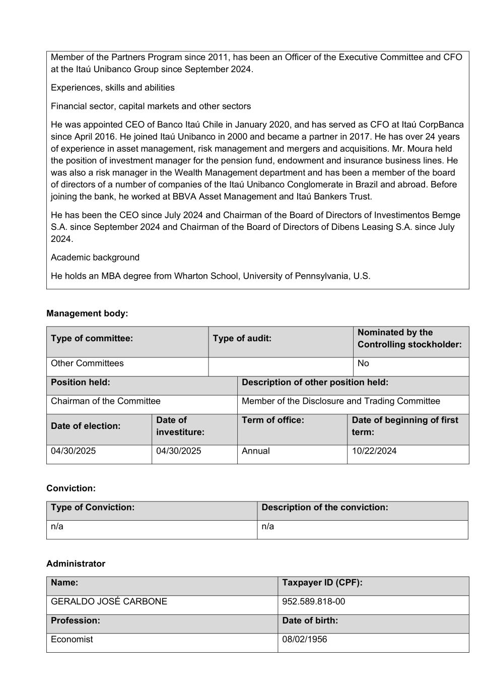 Member of the Partners Program since 2011, has been an Officer of the Executive Committee and CFO at the Itaú Unibanco Group since September 2024. Experiences, skills and abilities Financial sector, capital markets and other sectors He was appointed CEO of Banco Itaú Chile in January 2020, and has served as CFO at Itaú CorpBanca since April 2016. He joined Itaú Unibanco in 2000 and became a partner in 2017. He has over 24 years of experience in asset management, risk management and mergers and acquisitions. Mr. Moura held the position of investment manager for the pension fund, endowment and insurance business lines. He was also a risk manager in the Wealth Management department and has been a member of the board of directors of a number of companies of the Itaú Unibanco Conglomerate in Brazil and abroad. Before joining the bank, he worked at BBVA Asset Management and Itaú Bankers Trust. He has been the CEO since July 2024 and Chairman of the Board of Directors of Investimentos Bemge S.A. since September 2024 and Chairman of the Board of Directors of Dibens Leasing S.A. since July 2024. Academic background He holds an MBA degree from Wharton School, University of Pennsylvania, U.S. Management body: Type of committee: Type of audit: Nominated by the Controlling stockholder: Other Committees No Position held: Description of other position held: Chairman of the Committee Member of the Disclosure and Trading Committee Date of election: Date of investiture: Term of office: Date of beginning of first term: 04/30/2025 04/30/2025 Annual 10/22/2024 Conviction: Type of Conviction: Description of the conviction: n/a n/a Administrator Name: Taxpayer ID (CPF): GERALDO JOSÉ CARBONE 952.589.818-00 Profession: Date of birth: Economist 08/02/1956