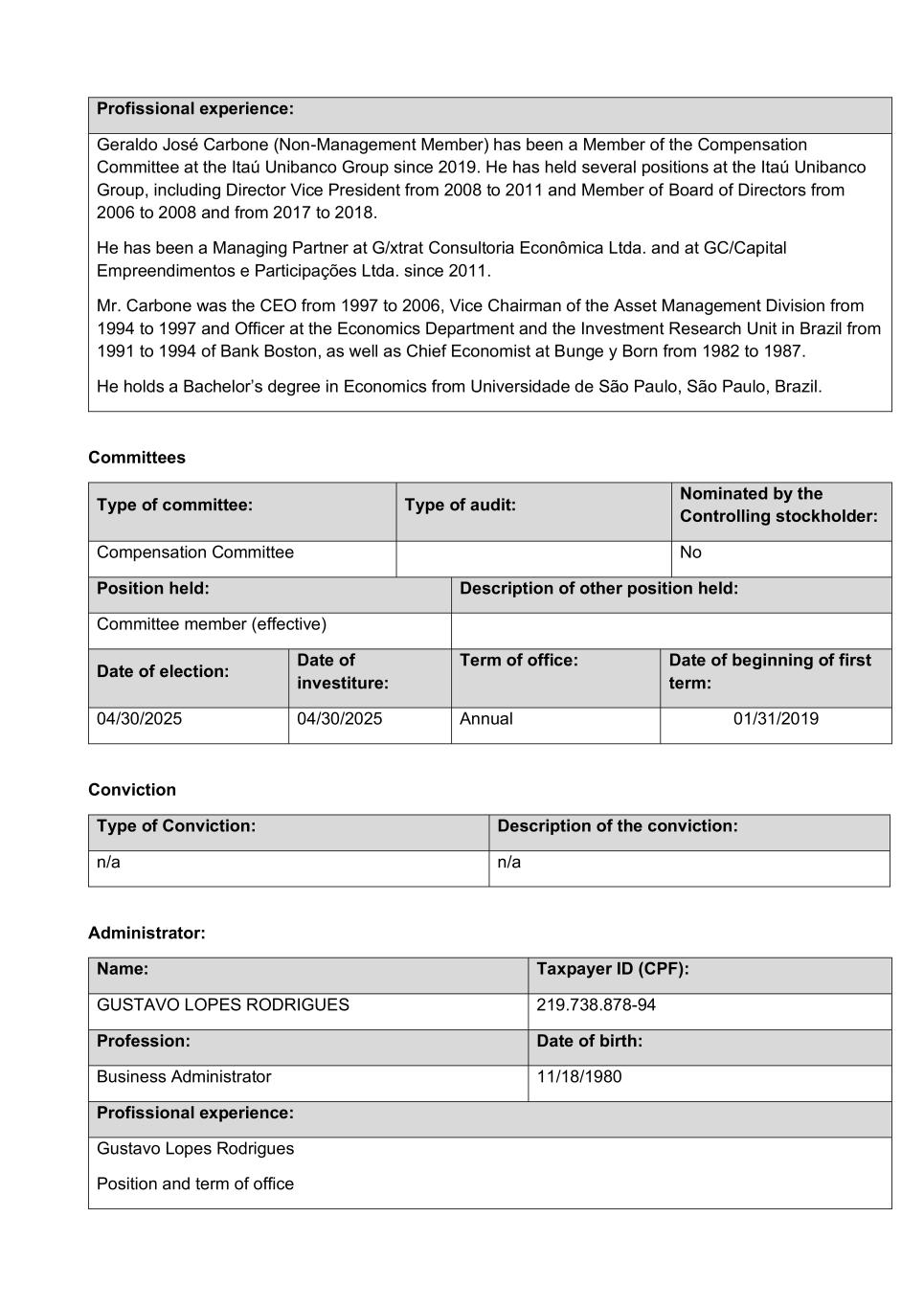 Profissional experience: Geraldo José Carbone (Non-Management Member) has been a Member of the Compensation Committee at the Itaú Unibanco Group since 2019. He has held several positions at the Itaú Unibanco Group, including Director Vice President from 2008 to 2011 and Member of Board of Directors from 2006 to 2008 and from 2017 to 2018. He has been a Managing Partner at G/xtrat Consultoria Econômica Ltda. and at GC/Capital Empreendimentos e Participações Ltda. since 2011. Mr. Carbone was the CEO from 1997 to 2006, Vice Chairman of the Asset Management Division from 1994 to 1997 and Officer at the Economics Department and the Investment Research Unit in Brazil from 1991 to 1994 of Bank Boston, as well as Chief Economist at Bunge y Born from 1982 to 1987. He holds a Bachelor’s degree in Economics from Universidade de São Paulo, São Paulo, Brazil. Committees Type of committee: Type of audit: Nominated by the Controlling stockholder: Compensation Committee No Position held: Description of other position held: Committee member (effective) Date of election: Date of investiture: Term of office: Date of beginning of first term: 04/30/2025 04/30/2025 Annual 01/31/2019 Conviction Type of Conviction: Description of the conviction: n/a n/a Administrator: Name: Taxpayer ID (CPF): GUSTAVO LOPES RODRIGUES 219.738.878-94 Profession: Date of birth: Business Administrator 11/18/1980 Profissional experience: Gustavo Lopes Rodrigues Position and term of office