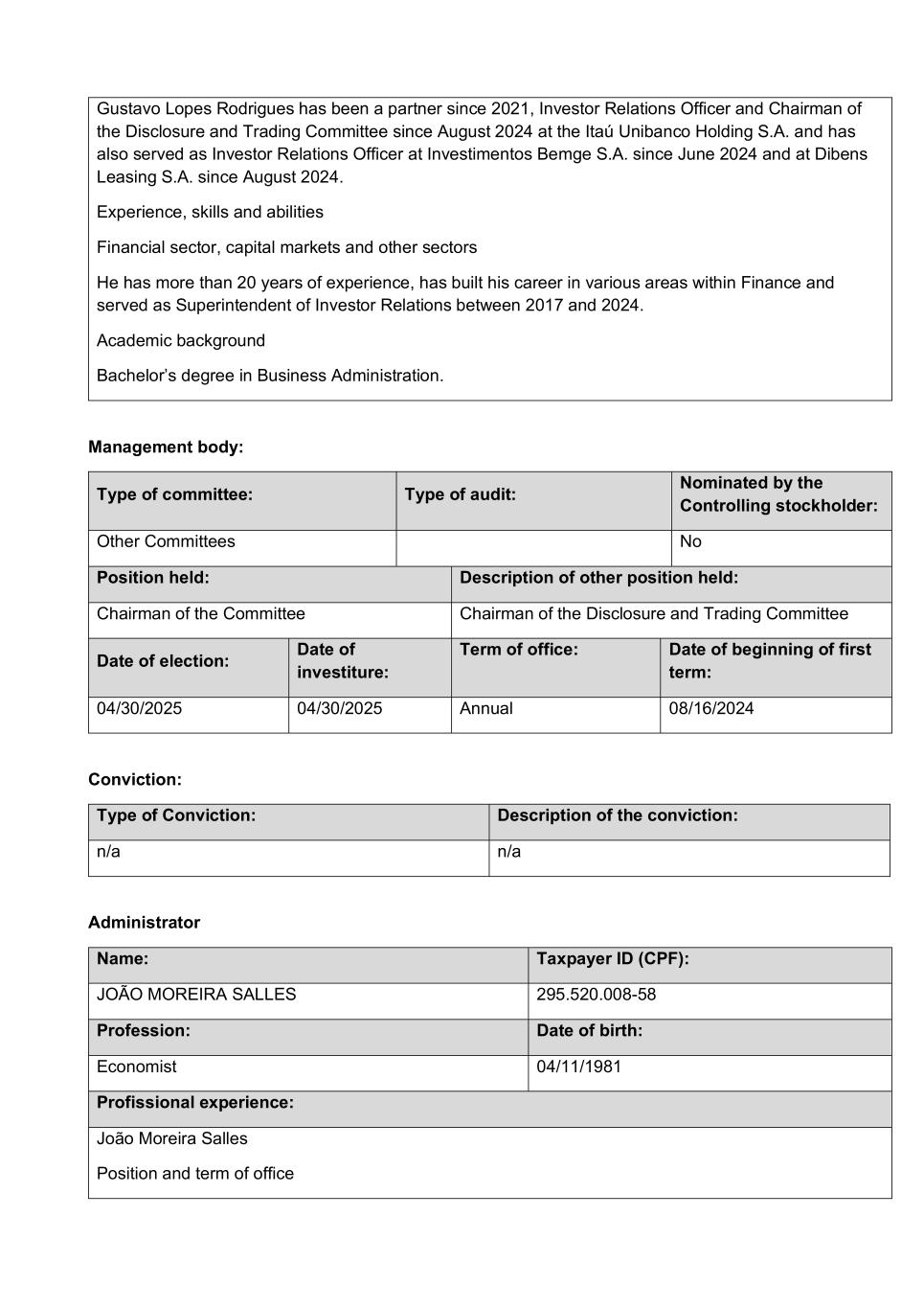Gustavo Lopes Rodrigues has been a partner since 2021, Investor Relations Officer and Chairman of the Disclosure and Trading Committee since August 2024 at the Itaú Unibanco Holding S.A. and has also served as Investor Relations Officer at Investimentos Bemge S.A. since June 2024 and at Dibens Leasing S.A. since August 2024. Experience, skills and abilities Financial sector, capital markets and other sectors He has more than 20 years of experience, has built his career in various areas within Finance and served as Superintendent of Investor Relations between 2017 and 2024. Academic background Bachelor’s degree in Business Administration. Management body: Type of committee: Type of audit: Nominated by the Controlling stockholder: Other Committees No Position held: Description of other position held: Chairman of the Committee Chairman of the Disclosure and Trading Committee Date of election: Date of investiture: Term of office: Date of beginning of first term: 04/30/2025 04/30/2025 Annual 08/16/2024 Conviction: Type of Conviction: Description of the conviction: n/a n/a Administrator Name: Taxpayer ID (CPF): JOÃO MOREIRA SALLES 295.520.008-58 Profession: Date of birth: Economist 04/11/1981 Profissional experience: João Moreira Salles Position and term of office