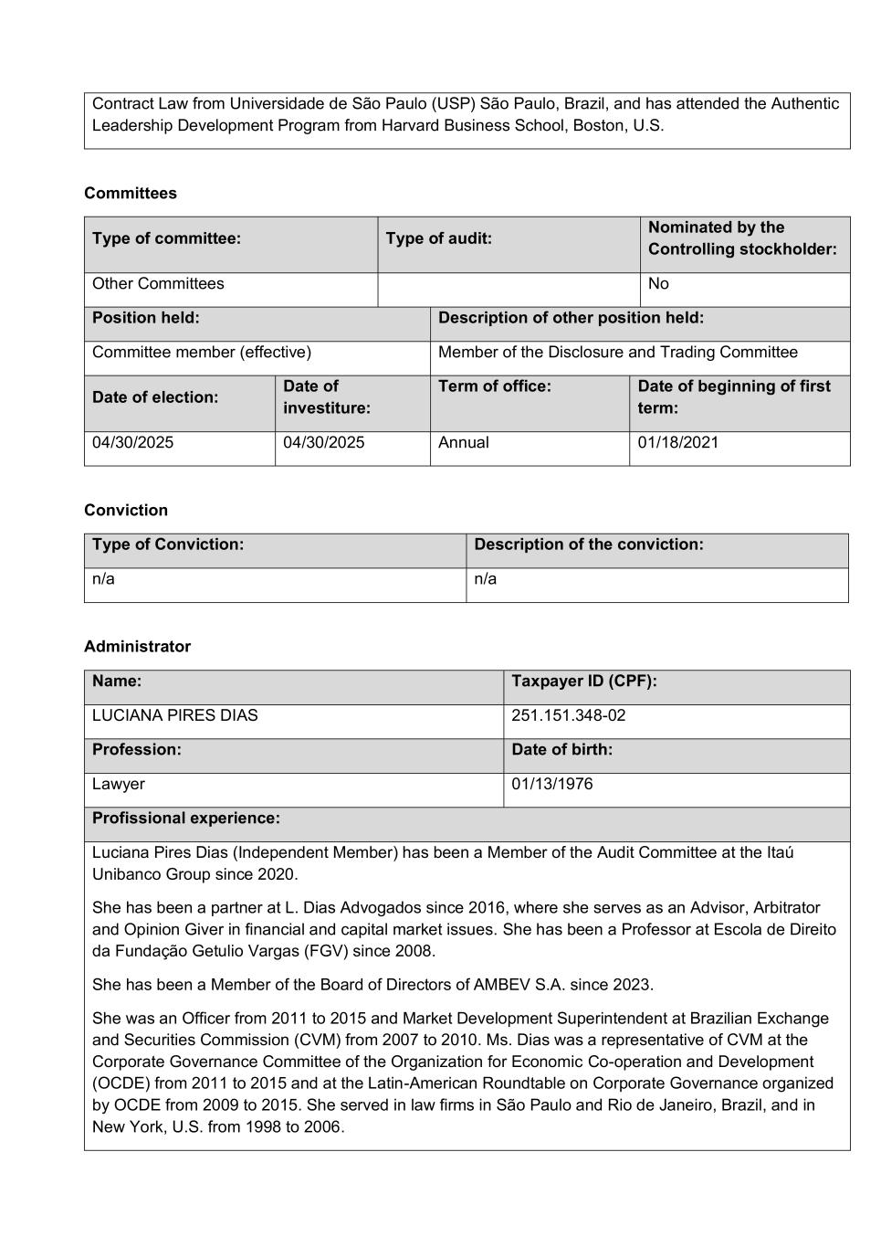 Contract Law from Universidade de São Paulo (USP) São Paulo, Brazil, and has attended the Authentic Leadership Development Program from Harvard Business School, Boston, U.S. Committees Type of committee: Type of audit: Nominated by the Controlling stockholder: Other Committees No Position held: Description of other position held: Committee member (effective) Member of the Disclosure and Trading Committee Date of election: Date of investiture: Term of office: Date of beginning of first term: 04/30/2025 04/30/2025 Annual 01/18/2021 Conviction Type of Conviction: Description of the conviction: n/a n/a Administrator Name: Taxpayer ID (CPF): LUCIANA PIRES DIAS 251.151.348-02 Profession: Date of birth: Lawyer 01/13/1976 Profissional experience: Luciana Pires Dias (Independent Member) has been a Member of the Audit Committee at the Itaú Unibanco Group since 2020. She has been a partner at L. Dias Advogados since 2016, where she serves as an Advisor, Arbitrator and Opinion Giver in financial and capital market issues. She has been a Professor at Escola de Direito da Fundação Getulio Vargas (FGV) since 2008. She has been a Member of the Board of Directors of AMBEV S.A. since 2023. She was an Officer from 2011 to 2015 and Market Development Superintendent at Brazilian Exchange and Securities Commission (CVM) from 2007 to 2010. Ms. Dias was a representative of CVM at the Corporate Governance Committee of the Organization for Economic Co-operation and Development (OCDE) from 2011 to 2015 and at the Latin-American Roundtable on Corporate Governance organized by OCDE from 2009 to 2015. She served in law firms in São Paulo and Rio de Janeiro, Brazil, and in New York, U.S. from 1998 to 2006.