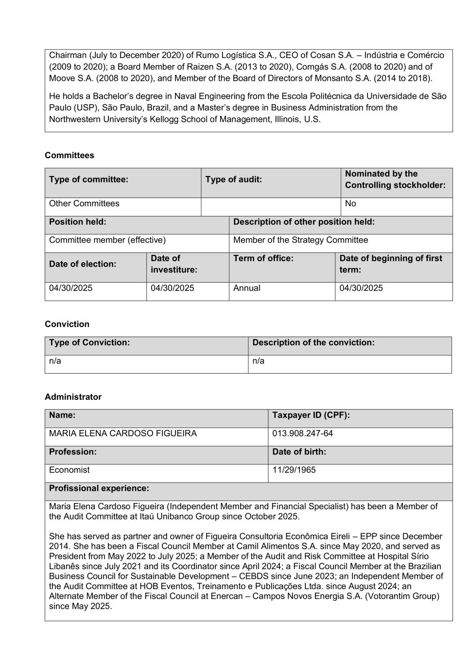 Chairman (July to December 2020) of Rumo Logística S.A., CEO of Cosan S.A. – Indústria e Comércio (2009 to 2020); a Board Member of Raizen S.A. (2013 to 2020), Comgás S.A. (2008 to 2020) and of Moove S.A. (2008 to 2020), and Member of the Board of Directors of Monsanto S.A. (2014 to 2018). He holds a Bachelor’s degree in Naval Engineering from the Escola Politécnica da Universidade de São Paulo (USP), São Paulo, Brazil, and a Master’s degree in Business Administration from the Northwestern University’s Kellogg School of Management, Illinois, U.S. Committees Type of committee: Type of audit: Nominated by the Controlling stockholder: Other Committees No Position held: Description of other position held: Committee member (effective) Member of the Strategy Committee Date of election: Date of investiture: Term of office: Date of beginning of first term: 04/30/2025 04/30/2025 Annual 04/30/2025 Conviction Type of Conviction: Description of the conviction: n/a n/a Administrator Name: Taxpayer ID (CPF): MARIA ELENA CARDOSO FIGUEIRA 013.908.247-64 Profession: Date of birth: Economist 11/29/1965 Profissional experience: Maria Elena Cardoso Figueira (Independent Member and Financial Specialist) has been a Member of the Audit Committee at Itaú Unibanco Group since October 2025. She has served as partner and owner of Figueira Consultoria Econômica Eireli – EPP since December 2014. She has been a Fiscal Council Member at Camil Alimentos S.A. since May 2020, and served as President from May 2022 to July 2025; a Member of the Audit and Risk Committee at Hospital Sírio Libanês since July 2021 and its Coordinator since April 2024; a Fiscal Council Member at the Brazilian Business Council for Sustainable Development – CEBDS since June 2023; an Independent Member of the Audit Committee at HOB Eventos, Treinamento e Publicações Ltda. since August 2024; an Alternate Member of the Fiscal Council at Enercan – Campos Novos Energia S.A. (Votorantim Group) since May 2025.