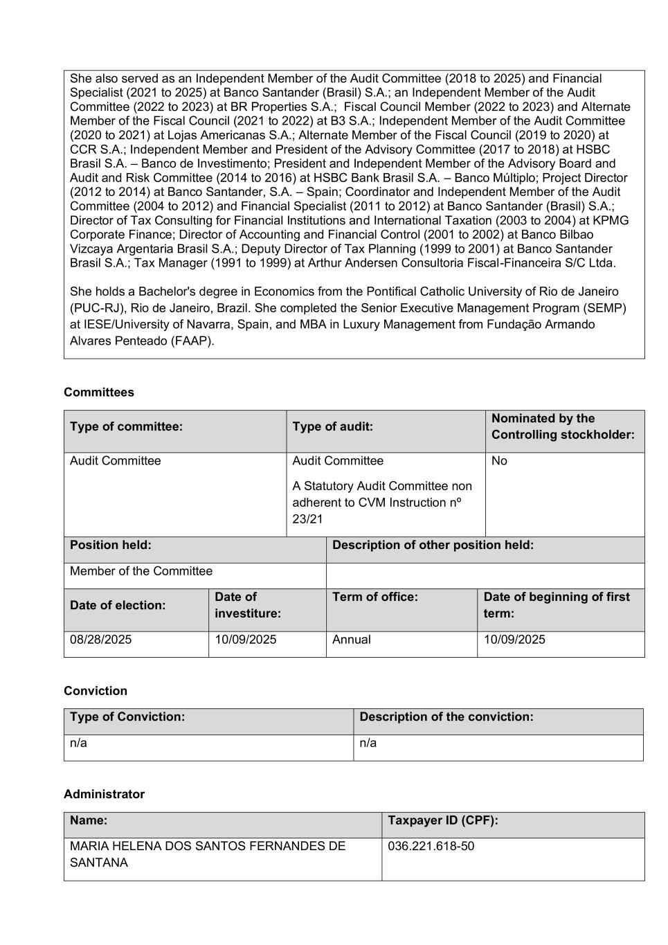 She also served as an Independent Member of the Audit Committee (2018 to 2025) and Financial Specialist (2021 to 2025) at Banco Santander (Brasil) S.A.; an Independent Member of the Audit Committee (2022 to 2023) at BR Properties S.A.; Fiscal Council Member (2022 to 2023) and Alternate Member of the Fiscal Council (2021 to 2022) at B3 S.A.; Independent Member of the Audit Committee (2020 to 2021) at Lojas Americanas S.A.; Alternate Member of the Fiscal Council (2019 to 2020) at CCR S.A.; Independent Member and President of the Advisory Committee (2017 to 2018) at HSBC Brasil S.A. – Banco de Investimento; President and Independent Member of the Advisory Board and Audit and Risk Committee (2014 to 2016) at HSBC Bank Brasil S.A. – Banco Múltiplo; Project Director (2012 to 2014) at Banco Santander, S.A. – Spain; Coordinator and Independent Member of the Audit Committee (2004 to 2012) and Financial Specialist (2011 to 2012) at Banco Santander (Brasil) S.A.; Director of Tax Consulting for Financial Institutions and International Taxation (2003 to 2004) at KPMG Corporate Finance; Director of Accounting and Financial Control (2001 to 2002) at Banco Bilbao Vizcaya Argentaria Brasil S.A.; Deputy Director of Tax Planning (1999 to 2001) at Banco Santander Brasil S.A.; Tax Manager (1991 to 1999) at Arthur Andersen Consultoria Fiscal-Financeira S/C Ltda. She holds a Bachelor's degree in Economics from the Pontifical Catholic University of Rio de Janeiro (PUC-RJ), Rio de Janeiro, Brazil. She completed the Senior Executive Management Program (SEMP) at IESE/University of Navarra, Spain, and MBA in Luxury Management from Fundação Armando Alvares Penteado (FAAP). Committees Type of committee: Type of audit: Nominated by the Controlling stockholder: Audit Committee Audit Committee A Statutory Audit Committee non adherent to CVM Instruction nº 23/21 No Position held: Description of other position held: Member of the Committee Date of election: Date of investiture: Term of office: Date of beginning of first term: 08/28/2025 10/09/2025 Annual 10/09/2025 Conviction Type of Conviction: Description of the conviction: n/a n/a Administrator Name: Taxpayer ID (CPF): MARIA HELENA DOS SANTOS FERNANDES DE SANTANA 036.221.618-50