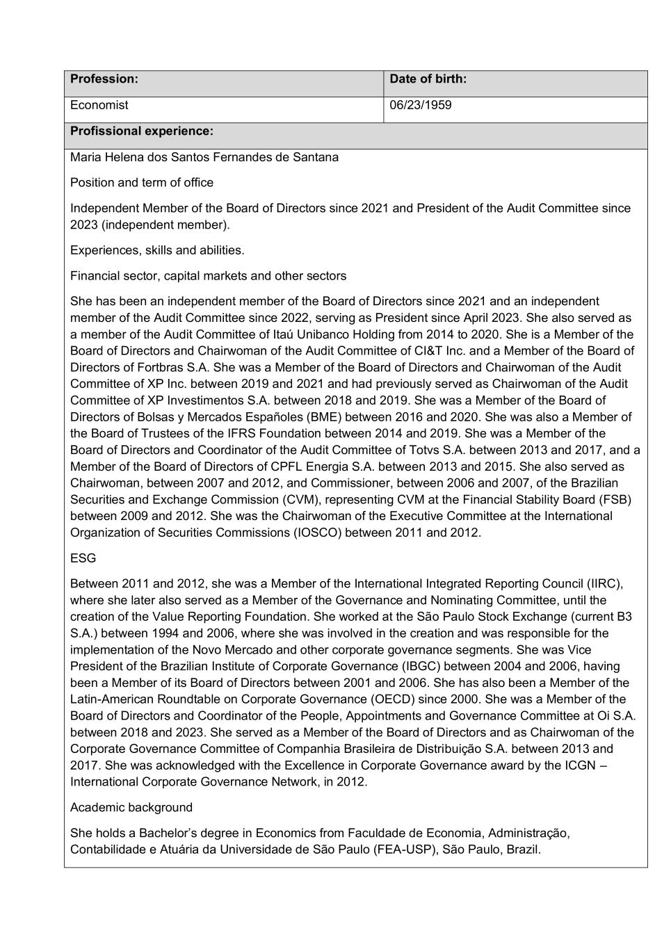 Profession: Date of birth: Economist 06/23/1959 Profissional experience: Maria Helena dos Santos Fernandes de Santana Position and term of office Independent Member of the Board of Directors since 2021 and President of the Audit Committee since 2023 (independent member). Experiences, skills and abilities. Financial sector, capital markets and other sectors She has been an independent member of the Board of Directors since 2021 and an independent member of the Audit Committee since 2022, serving as President since April 2023. She also served as a member of the Audit Committee of Itaú Unibanco Holding from 2014 to 2020. She is a Member of the Board of Directors and Chairwoman of the Audit Committee of CI&T Inc. and a Member of the Board of Directors of Fortbras S.A. She was a Member of the Board of Directors and Chairwoman of the Audit Committee of XP Inc. between 2019 and 2021 and had previously served as Chairwoman of the Audit Committee of XP Investimentos S.A. between 2018 and 2019. She was a Member of the Board of Directors of Bolsas y Mercados Españoles (BME) between 2016 and 2020. She was also a Member of the Board of Trustees of the IFRS Foundation between 2014 and 2019. She was a Member of the Board of Directors and Coordinator of the Audit Committee of Totvs S.A. between 2013 and 2017, and a Member of the Board of Directors of CPFL Energia S.A. between 2013 and 2015. She also served as Chairwoman, between 2007 and 2012, and Commissioner, between 2006 and 2007, of the Brazilian Securities and Exchange Commission (CVM), representing CVM at the Financial Stability Board (FSB) between 2009 and 2012. She was the Chairwoman of the Executive Committee at the International Organization of Securities Commissions (IOSCO) between 2011 and 2012. ESG Between 2011 and 2012, she was a Member of the International Integrated Reporting Council (IIRC), where she later also served as a Member of the Governance and Nominating Committee, until the creation of the Value Reporting Foundation. She worked at the São Paulo Stock Exchange (current B3 S.A.) between 1994 and 2006, where she was involved in the creation and was responsible for the implementation of the Novo Mercado and other corporate governance segments. She was Vice President of the Brazilian Institute of Corporate Governance (IBGC) between 2004 and 2006, having been a Member of its Board of Directors between 2001 and 2006. She has also been a Member of the Latin-American Roundtable on Corporate Governance (OECD) since 2000. She was a Member of the Board of Directors and Coordinator of the People, Appointments and Governance Committee at Oi S.A. between 2018 and 2023. She served as a Member of the Board of Directors and as Chairwoman of the Corporate Governance Committee of Companhia Brasileira de Distribuição S.A. between 2013 and 2017. She was acknowledged with the Excellence in Corporate Governance award by the ICGN – International Corporate Governance Network, in 2012. Academic background She holds a Bachelor’s degree in Economics from Faculdade de Economia, Administração, Contabilidade e Atuária da Universidade de São Paulo (FEA-USP), São Paulo, Brazil.