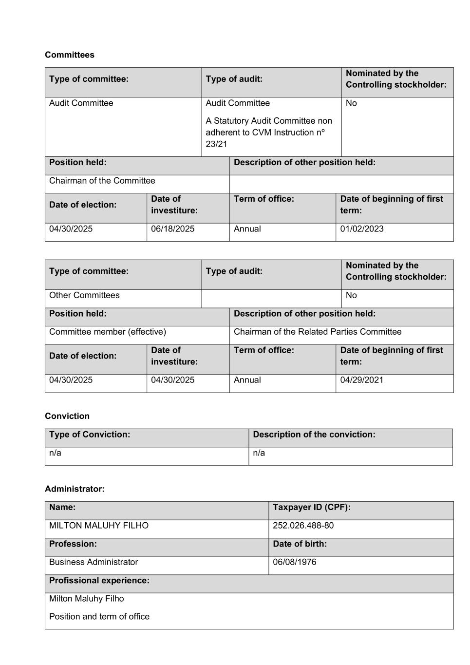 Committees Type of committee: Type of audit: Nominated by the Controlling stockholder: Audit Committee Audit Committee A Statutory Audit Committee non adherent to CVM Instruction nº 23/21 No Position held: Description of other position held: Chairman of the Committee Date of election: Date of investiture: Term of office: Date of beginning of first term: 04/30/2025 06/18/2025 Annual 01/02/2023 Type of committee: Type of audit: Nominated by the Controlling stockholder: Other Committees No Position held: Description of other position held: Committee member (effective) Chairman of the Related Parties Committee Date of election: Date of investiture: Term of office: Date of beginning of first term: 04/30/2025 04/30/2025 Annual 04/29/2021 Conviction Type of Conviction: Description of the conviction: n/a n/a Administrator: Name: Taxpayer ID (CPF): MILTON MALUHY FILHO 252.026.488-80 Profession: Date of birth: Business Administrator 06/08/1976 Profissional experience: Milton Maluhy Filho Position and term of office