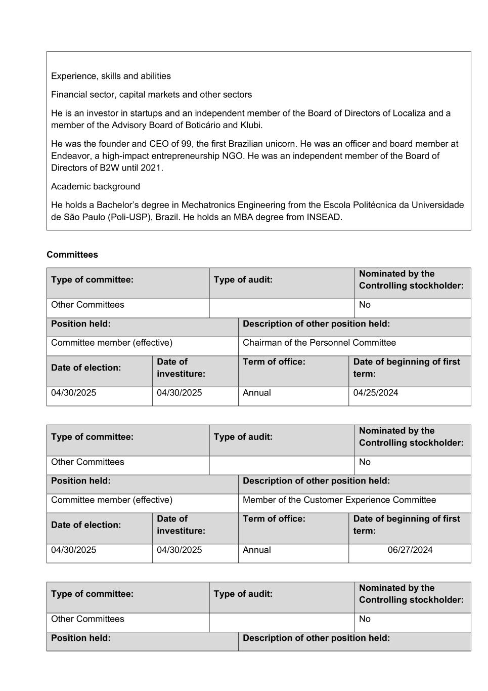 Experience, skills and abilities Financial sector, capital markets and other sectors He is an investor in startups and an independent member of the Board of Directors of Localiza and a member of the Advisory Board of Boticário and Klubi. He was the founder and CEO of 99, the first Brazilian unicorn. He was an officer and board member at Endeavor, a high-impact entrepreneurship NGO. He was an independent member of the Board of Directors of B2W until 2021. Academic background He holds a Bachelor’s degree in Mechatronics Engineering from the Escola Politécnica da Universidade de São Paulo (Poli-USP), Brazil. He holds an MBA degree from INSEAD. Committees Type of committee: Type of audit: Nominated by the Controlling stockholder: Other Committees No Position held: Description of other position held: Committee member (effective) Chairman of the Personnel Committee Date of election: Date of investiture: Term of office: Date of beginning of first term: 04/30/2025 04/30/2025 Annual 04/25/2024 Type of committee: Type of audit: Nominated by the Controlling stockholder: Other Committees No Position held: Description of other position held: Committee member (effective) Member of the Customer Experience Committee Date of election: Date of investiture: Term of office: Date of beginning of first term: 04/30/2025 04/30/2025 Annual 06/27/2024 Type of committee: Type of audit: Nominated by the Controlling stockholder: Other Committees No Position held: Description of other position held: