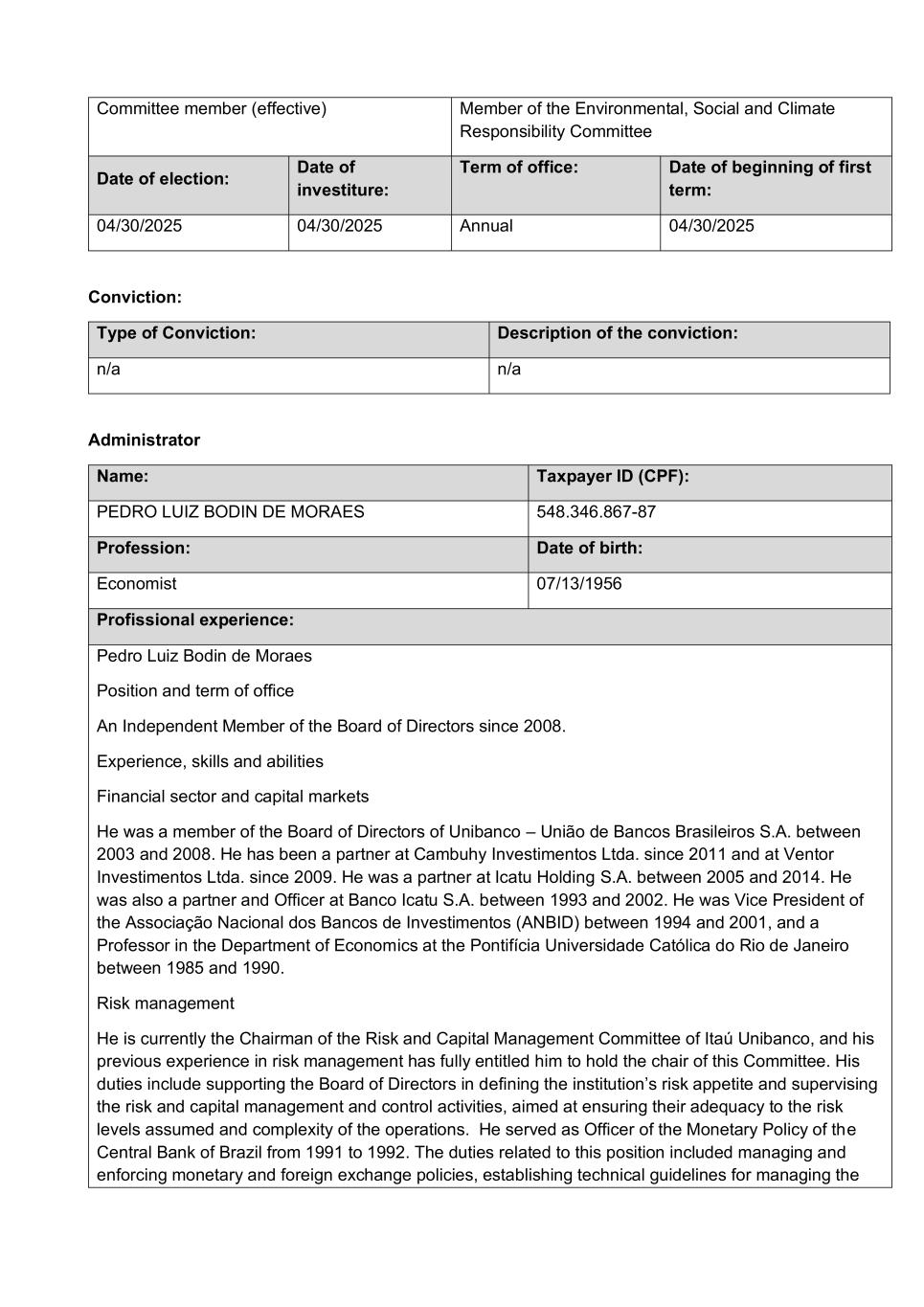 Committee member (effective) Member of the Environmental, Social and Climate Responsibility Committee Date of election: Date of investiture: Term of office: Date of beginning of first term: 04/30/2025 04/30/2025 Annual 04/30/2025 Conviction: Type of Conviction: Description of the conviction: n/a n/a Administrator Name: Taxpayer ID (CPF): PEDRO LUIZ BODIN DE MORAES 548.346.867-87 Profession: Date of birth: Economist 07/13/1956 Profissional experience: Pedro Luiz Bodin de Moraes Position and term of office An Independent Member of the Board of Directors since 2008. Experience, skills and abilities Financial sector and capital markets He was a member of the Board of Directors of Unibanco – União de Bancos Brasileiros S.A. between 2003 and 2008. He has been a partner at Cambuhy Investimentos Ltda. since 2011 and at Ventor Investimentos Ltda. since 2009. He was a partner at Icatu Holding S.A. between 2005 and 2014. He was also a partner and Officer at Banco Icatu S.A. between 1993 and 2002. He was Vice President of the Associação Nacional dos Bancos de Investimentos (ANBID) between 1994 and 2001, and a Professor in the Department of Economics at the Pontifícia Universidade Católica do Rio de Janeiro between 1985 and 1990. Risk management He is currently the Chairman of the Risk and Capital Management Committee of Itaú Unibanco, and his previous experience in risk management has fully entitled him to hold the chair of this Committee. His duties include supporting the Board of Directors in defining the institution’s risk appetite and supervising the risk and capital management and control activities, aimed at ensuring their adequacy to the risk levels assumed and complexity of the operations. He served as Officer of the Monetary Policy of the Central Bank of Brazil from 1991 to 1992. The duties related to this position included managing and enforcing monetary and foreign exchange policies, establishing technical guidelines for managing the