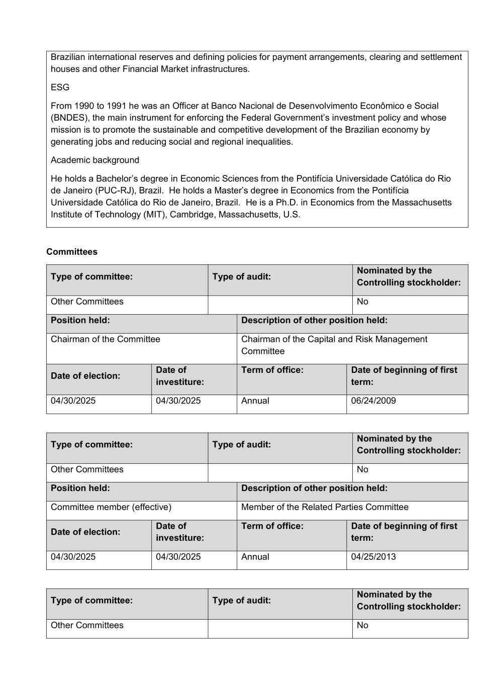 Brazilian international reserves and defining policies for payment arrangements, clearing and settlement houses and other Financial Market infrastructures. ESG From 1990 to 1991 he was an Officer at Banco Nacional de Desenvolvimento Econômico e Social (BNDES), the main instrument for enforcing the Federal Government’s investment policy and whose mission is to promote the sustainable and competitive development of the Brazilian economy by generating jobs and reducing social and regional inequalities. Academic background He holds a Bachelor’s degree in Economic Sciences from the Pontifícia Universidade Católica do Rio de Janeiro (PUC-RJ), Brazil. He holds a Master’s degree in Economics from the Pontifícia Universidade Católica do Rio de Janeiro, Brazil. He is a Ph.D. in Economics from the Massachusetts Institute of Technology (MIT), Cambridge, Massachusetts, U.S. Committees Type of committee: Type of audit: Nominated by the Controlling stockholder: Other Committees No Position held: Description of other position held: Chairman of the Committee Chairman of the Capital and Risk Management Committee Date of election: Date of investiture: Term of office: Date of beginning of first term: 04/30/2025 04/30/2025 Annual 06/24/2009 Type of committee: Type of audit: Nominated by the Controlling stockholder: Other Committees No Position held: Description of other position held: Committee member (effective) Member of the Related Parties Committee Date of election: Date of investiture: Term of office: Date of beginning of first term: 04/30/2025 04/30/2025 Annual 04/25/2013 Type of committee: Type of audit: Nominated by the Controlling stockholder: Other Committees No