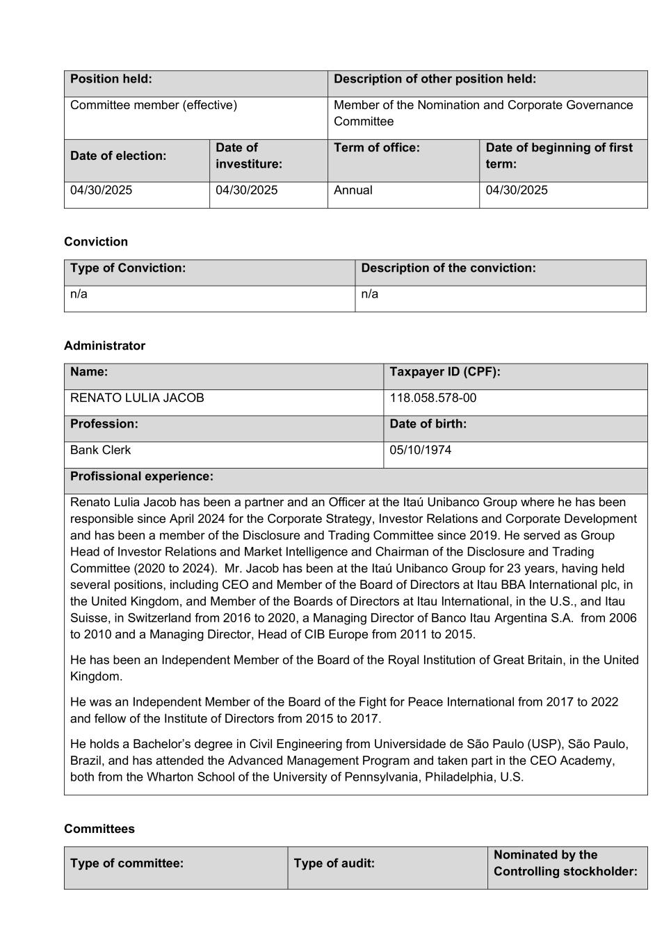 Position held: Description of other position held: Committee member (effective) Member of the Nomination and Corporate Governance Committee Date of election: Date of investiture: Term of office: Date of beginning of first term: 04/30/2025 04/30/2025 Annual 04/30/2025 Conviction Type of Conviction: Description of the conviction: n/a n/a Administrator Name: Taxpayer ID (CPF): RENATO LULIA JACOB 118.058.578-00 Profession: Date of birth: Bank Clerk 05/10/1974 Profissional experience: Renato Lulia Jacob has been a partner and an Officer at the Itaú Unibanco Group where he has been responsible since April 2024 for the Corporate Strategy, Investor Relations and Corporate Development and has been a member of the Disclosure and Trading Committee since 2019. He served as Group Head of Investor Relations and Market Intelligence and Chairman of the Disclosure and Trading Committee (2020 to 2024). Mr. Jacob has been at the Itaú Unibanco Group for 23 years, having held several positions, including CEO and Member of the Board of Directors at Itau BBA International plc, in the United Kingdom, and Member of the Boards of Directors at Itau International, in the U.S., and Itau Suisse, in Switzerland from 2016 to 2020, a Managing Director of Banco Itau Argentina S.A. from 2006 to 2010 and a Managing Director, Head of CIB Europe from 2011 to 2015. He has been an Independent Member of the Board of the Royal Institution of Great Britain, in the United Kingdom. He was an Independent Member of the Board of the Fight for Peace International from 2017 to 2022 and fellow of the Institute of Directors from 2015 to 2017. He holds a Bachelor’s degree in Civil Engineering from Universidade de São Paulo (USP), São Paulo, Brazil, and has attended the Advanced Management Program and taken part in the CEO Academy, both from the Wharton School of the University of Pennsylvania, Philadelphia, U.S. Committees Type of committee: Type of audit: Nominated by the Controlling stockholder: