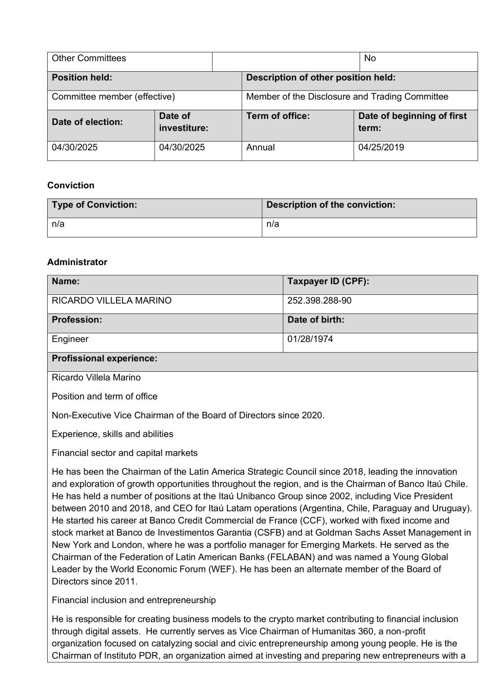 Other Committees No Position held: Description of other position held: Committee member (effective) Member of the Disclosure and Trading Committee Date of election: Date of investiture: Term of office: Date of beginning of first term: 04/30/2025 04/30/2025 Annual 04/25/2019 Conviction Type of Conviction: Description of the conviction: n/a n/a Administrator Name: Taxpayer ID (CPF): RICARDO VILLELA MARINO 252.398.288-90 Profession: Date of birth: Engineer 01/28/1974 Profissional experience: Ricardo Villela Marino Position and term of office Non-Executive Vice Chairman of the Board of Directors since 2020. Experience, skills and abilities Financial sector and capital markets He has been the Chairman of the Latin America Strategic Council since 2018, leading the innovation and exploration of growth opportunities throughout the region, and is the Chairman of Banco Itaú Chile. He has held a number of positions at the Itaú Unibanco Group since 2002, including Vice President between 2010 and 2018, and CEO for Itaú Latam operations (Argentina, Chile, Paraguay and Uruguay). He started his career at Banco Credit Commercial de France (CCF), worked with fixed income and stock market at Banco de Investimentos Garantia (CSFB) and at Goldman Sachs Asset Management in New York and London, where he was a portfolio manager for Emerging Markets. He served as the Chairman of the Federation of Latin American Banks (FELABAN) and was named a Young Global Leader by the World Economic Forum (WEF). He has been an alternate member of the Board of Directors since 2011. Financial inclusion and entrepreneurship He is responsible for creating business models to the crypto market contributing to financial inclusion through digital assets. He currently serves as Vice Chairman of Humanitas 360, a non-profit organization focused on catalyzing social and civic entrepreneurship among young people. He is the Chairman of Instituto PDR, an organization aimed at investing and preparing new entrepreneurs with a