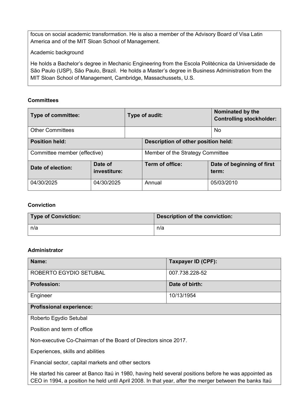 focus on social academic transformation. He is also a member of the Advisory Board of Visa Latin America and of the MIT Sloan School of Management. Academic background He holds a Bachelor’s degree in Mechanic Engineering from the Escola Politécnica da Universidade de São Paulo (USP), São Paulo, Brazil. He holds a Master’s degree in Business Administration from the MIT Sloan School of Management, Cambridge, Massachussets, U.S. Committees Type of committee: Type of audit: Nominated by the Controlling stockholder: Other Committees No Position held: Description of other position held: Committee member (effective) Member of the Strategy Committee Date of election: Date of investiture: Term of office: Date of beginning of first term: 04/30/2025 04/30/2025 Annual 05/03/2010 Conviction Type of Conviction: Description of the conviction: n/a n/a Administrator Name: Taxpayer ID (CPF): ROBERTO EGYDIO SETUBAL 007.738.228-52 Profession: Date of birth: Engineer 10/13/1954 Profissional experience: Roberto Egydio Setubal Position and term of office Non-executive Co-Chairman of the Board of Directors since 2017. Experiences, skills and abilities Financial sector, capital markets and other sectors He started his career at Banco Itaú in 1980, having held several positions before he was appointed as CEO in 1994, a position he held until April 2008. In that year, after the merger between the banks Itaú