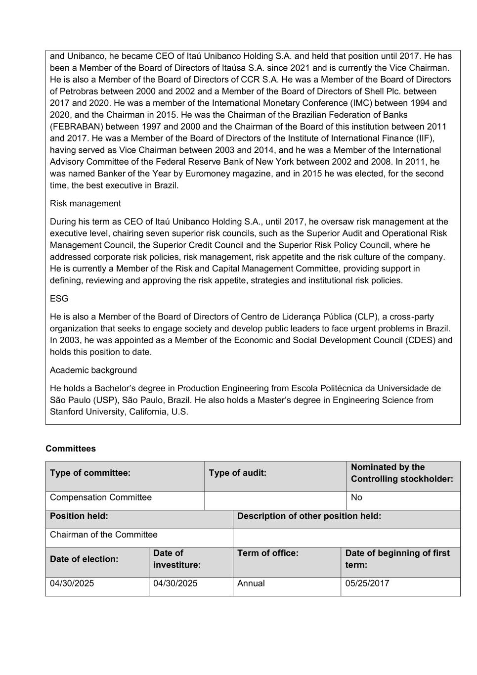 and Unibanco, he became CEO of Itaú Unibanco Holding S.A. and held that position until 2017. He has been a Member of the Board of Directors of Itaúsa S.A. since 2021 and is currently the Vice Chairman. He is also a Member of the Board of Directors of CCR S.A. He was a Member of the Board of Directors of Petrobras between 2000 and 2002 and a Member of the Board of Directors of Shell Plc. between 2017 and 2020. He was a member of the International Monetary Conference (IMC) between 1994 and 2020, and the Chairman in 2015. He was the Chairman of the Brazilian Federation of Banks (FEBRABAN) between 1997 and 2000 and the Chairman of the Board of this institution between 2011 and 2017. He was a Member of the Board of Directors of the Institute of International Finance (IIF), having served as Vice Chairman between 2003 and 2014, and he was a Member of the International Advisory Committee of the Federal Reserve Bank of New York between 2002 and 2008. In 2011, he was named Banker of the Year by Euromoney magazine, and in 2015 he was elected, for the second time, the best executive in Brazil. Risk management During his term as CEO of Itaú Unibanco Holding S.A., until 2017, he oversaw risk management at the executive level, chairing seven superior risk councils, such as the Superior Audit and Operational Risk Management Council, the Superior Credit Council and the Superior Risk Policy Council, where he addressed corporate risk policies, risk management, risk appetite and the risk culture of the company. He is currently a Member of the Risk and Capital Management Committee, providing support in defining, reviewing and approving the risk appetite, strategies and institutional risk policies. ESG He is also a Member of the Board of Directors of Centro de Liderança Pública (CLP), a cross-party organization that seeks to engage society and develop public leaders to face urgent problems in Brazil. In 2003, he was appointed as a Member of the Economic and Social Development Council (CDES) and holds this position to date. Academic background He holds a Bachelor’s degree in Production Engineering from Escola Politécnica da Universidade de São Paulo (USP), São Paulo, Brazil. He also holds a Master’s degree in Engineering Science from Stanford University, California, U.S. Committees Type of committee: Type of audit: Nominated by the Controlling stockholder: Compensation Committee No Position held: Description of other position held: Chairman of the Committee Date of election: Date of investiture: Term of office: Date of beginning of first term: 04/30/2025 04/30/2025 Annual 05/25/2017