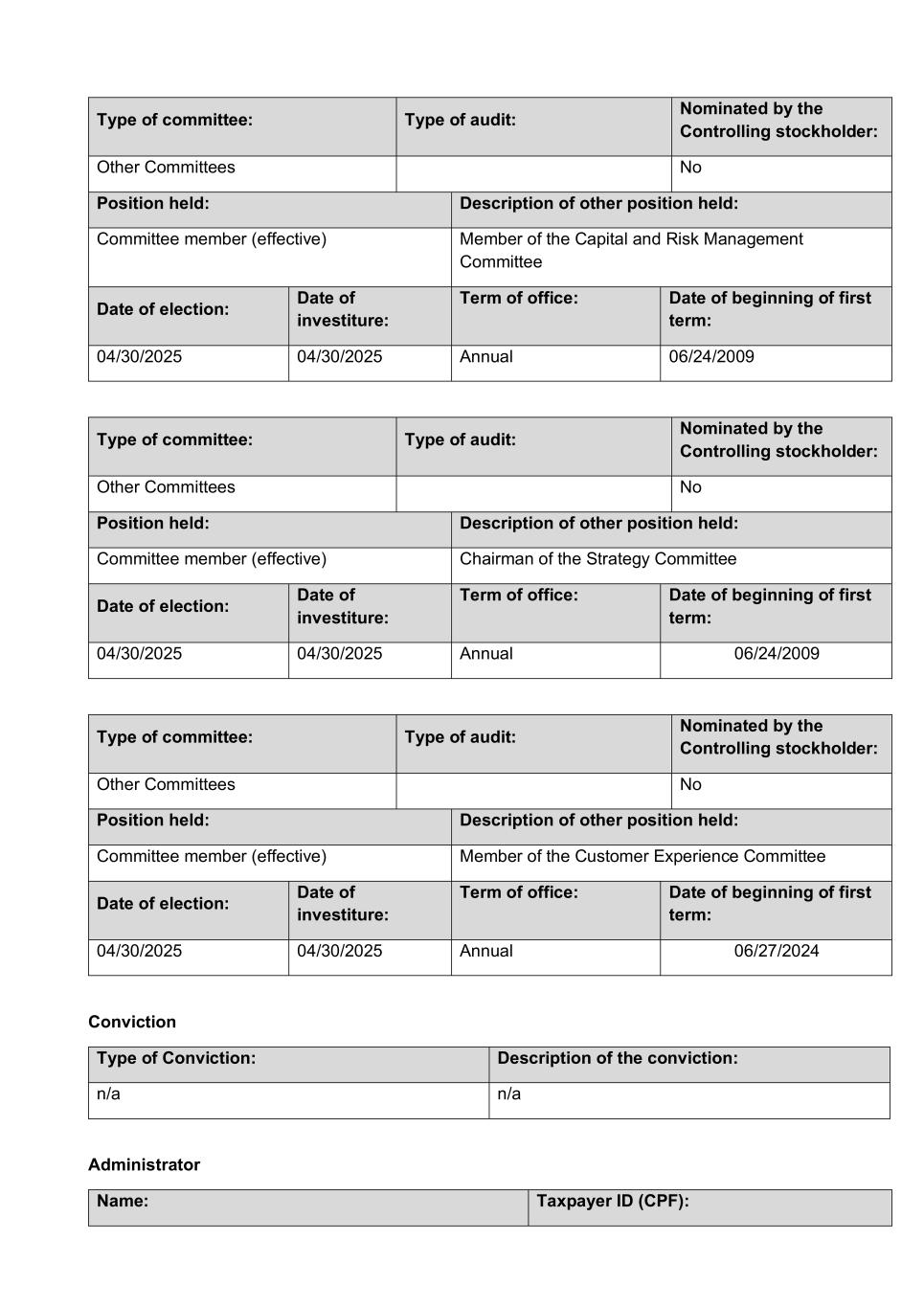 Type of committee: Type of audit: Nominated by the Controlling stockholder: Other Committees No Position held: Description of other position held: Committee member (effective) Member of the Capital and Risk Management Committee Date of election: Date of investiture: Term of office: Date of beginning of first term: 04/30/2025 04/30/2025 Annual 06/24/2009 Type of committee: Type of audit: Nominated by the Controlling stockholder: Other Committees No Position held: Description of other position held: Committee member (effective) Chairman of the Strategy Committee Date of election: Date of investiture: Term of office: Date of beginning of first term: 04/30/2025 04/30/2025 Annual 06/24/2009 Type of committee: Type of audit: Nominated by the Controlling stockholder: Other Committees No Position held: Description of other position held: Committee member (effective) Member of the Customer Experience Committee Date of election: Date of investiture: Term of office: Date of beginning of first term: 04/30/2025 04/30/2025 Annual 06/27/2024 Conviction Type of Conviction: Description of the conviction: n/a n/a Administrator Name: Taxpayer ID (CPF):