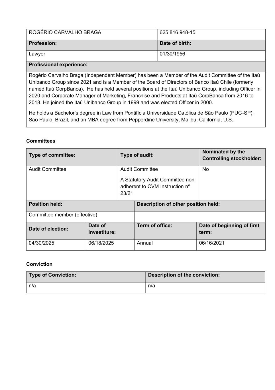 ROGÉRIO CARVALHO BRAGA 625.816.948-15 Profession: Date of birth: Lawyer 01/30/1956 Profissional experience: Rogério Carvalho Braga (Independent Member) has been a Member of the Audit Committee of the Itaú Unibanco Group since 2021 and is a Member of the Board of Directors of Banco Itaú Chile (formerly named Itaú CorpBanca). He has held several positions at the Itaú Unibanco Group, including Officer in 2020 and Corporate Manager of Marketing, Franchise and Products at Itaú CorpBanca from 2016 to 2018. He joined the Itaú Unibanco Group in 1999 and was elected Officer in 2000. He holds a Bachelor’s degree in Law from Pontifícia Universidade Católica de São Paulo (PUC-SP), São Paulo, Brazil, and an MBA degree from Pepperdine University, Malibu, California, U.S. Committees Type of committee: Type of audit: Nominated by the Controlling stockholder: Audit Committee Audit Committee A Statutory Audit Committee non adherent to CVM Instruction nº 23/21 No Position held: Description of other position held: Committee member (effective) Date of election: Date of investiture: Term of office: Date of beginning of first term: 04/30/2025 06/18/2025 Annual 06/16/2021 Conviction Type of Conviction: Description of the conviction: n/a n/a