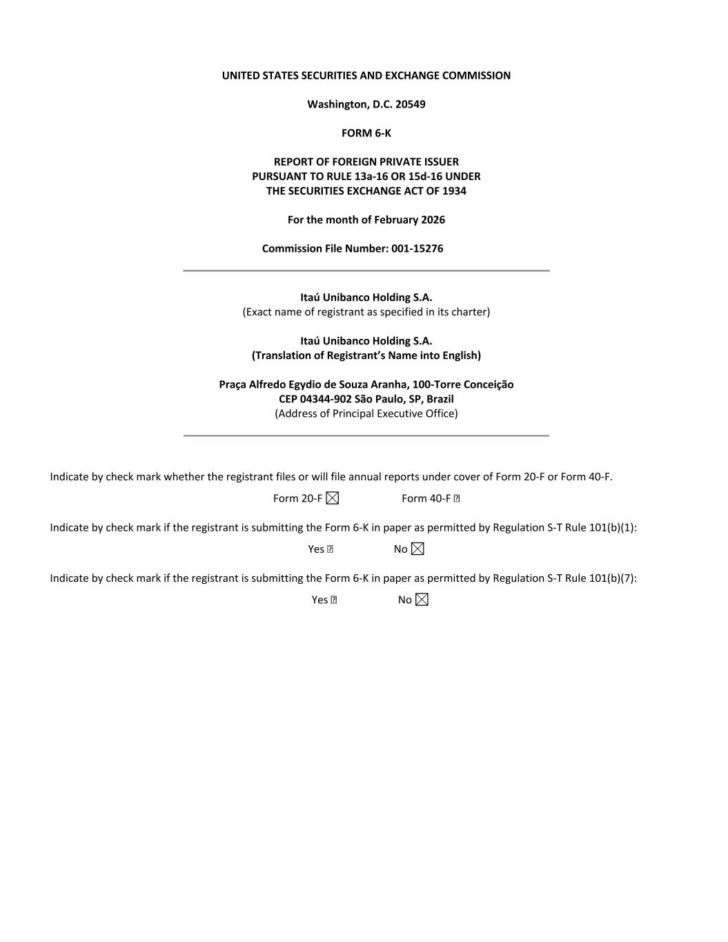 UNITED STATES SECURITIES AND EXCHANGE COMMISSION Washington, D.C. 20549 FORM 6-K REPORT OF FOREIGN PRIVATE ISSUER PURSUANT TO RULE 13a-16 OR 15d-16 UNDER THE SECURITIES EXCHANGE ACT OF 1934 For the month of February 2026 Commission File Number: 001-15276 Itaú Unibanco Holding S.A. (Exact name of registrant as specified in its charter) Itaú Unibanco Holding S.A. (Translation of Registrant’s Name into English) Praça Alfredo Egydio de Souza Aranha, 100-Torre Conceição CEP 04344-902 São Paulo, SP, Brazil (Address of Principal Executive Office) Indicate by check mark whether the registrant files or will file annual reports under cover of Form 20-F or Form 40-F. Form 20-F Form 40-F Indicate by check mark if the registrant is submitting the Form 6-K in paper as permitted by Regulation S-T Rule 101(b)(1): Yes No Indicate by check mark if the registrant is submitting the Form 6-K in paper as permitted by Regulation S-T Rule 101(b)(7): Yes No