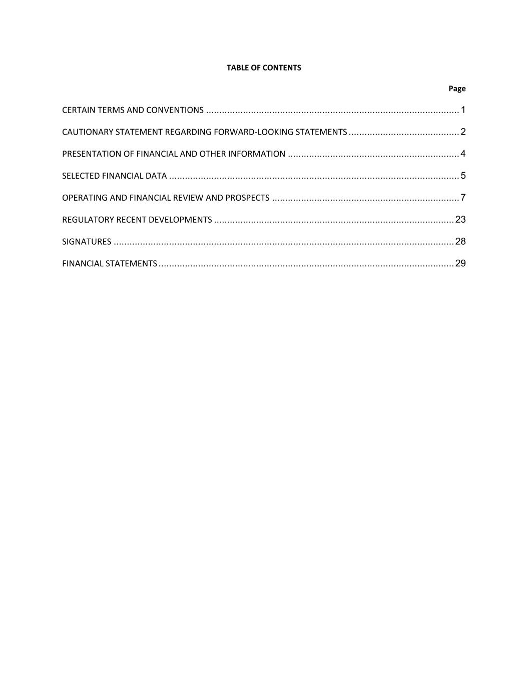 TABLE OF CONTENTS Page CERTAIN TERMS AND CONVENTIONS ................................................................................................ 1 CAUTIONARY STATEMENT REGARDING FORWARD-LOOKING STATEMENTS .......................................... 2 PRESENTATION OF FINANCIAL AND OTHER INFORMATION ................................................................. 4 SELECTED FINANCIAL DATA .............................................................................................................. 5 OPERATING AND FINANCIAL REVIEW AND PROSPECTS ....................................................................... 7 REGULATORY RECENT DEVELOPMENTS ........................................................................................... 23 SIGNATURES ................................................................................................................................. 28 FINANCIAL STATEMENTS ................................................................................................................ 29