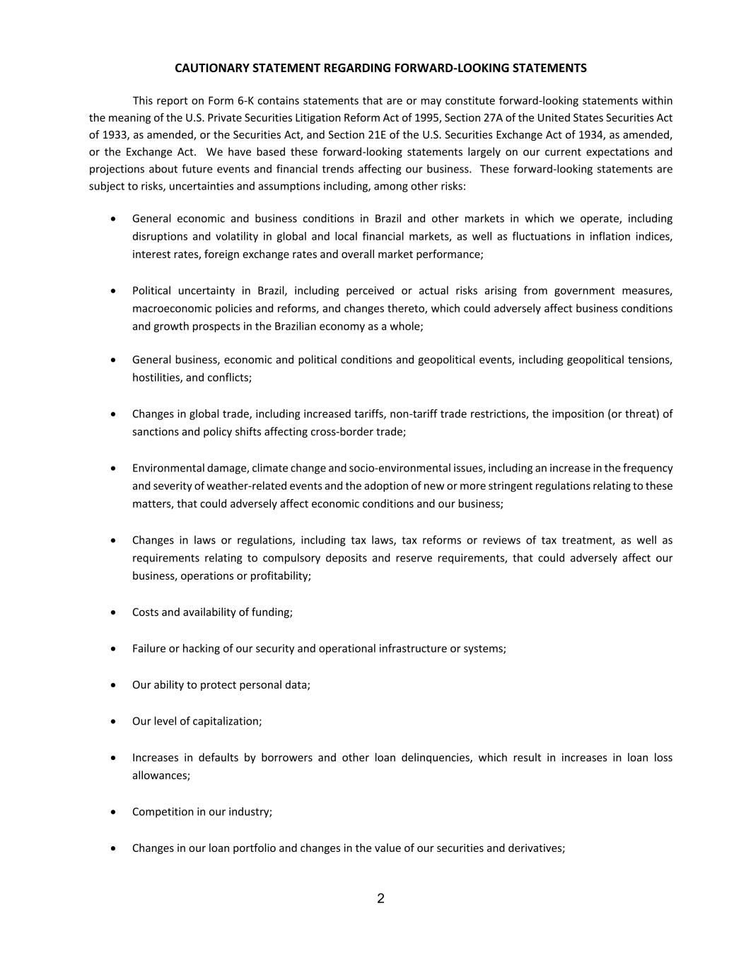 2 CAUTIONARY STATEMENT REGARDING FORWARD-LOOKING STATEMENTS This report on Form 6-K contains statements that are or may constitute forward-looking statements within the meaning of the U.S. Private Securities Litigation Reform Act of 1995, Section 27A of the United States Securities Act of 1933, as amended, or the Securities Act, and Section 21E of the U.S. Securities Exchange Act of 1934, as amended, or the Exchange Act. We have based these forward-looking statements largely on our current expectations and projections about future events and financial trends affecting our business. These forward-looking statements are subject to risks, uncertainties and assumptions including, among other risks: • General economic and business conditions in Brazil and other markets in which we operate, including disruptions and volatility in global and local financial markets, as well as fluctuations in inflation indices, interest rates, foreign exchange rates and overall market performance; • Political uncertainty in Brazil, including perceived or actual risks arising from government measures, macroeconomic policies and reforms, and changes thereto, which could adversely affect business conditions and growth prospects in the Brazilian economy as a whole; • General business, economic and political conditions and geopolitical events, including geopolitical tensions, hostilities, and conflicts; • Changes in global trade, including increased tariffs, non-tariff trade restrictions, the imposition (or threat) of sanctions and policy shifts affecting cross-border trade; • Environmental damage, climate change and socio-environmental issues, including an increase in the frequency and severity of weather-related events and the adoption of new or more stringent regulations relating to these matters, that could adversely affect economic conditions and our business; • Changes in laws or regulations, including tax laws, tax reforms or reviews of tax treatment, as well as requirements relating to compulsory deposits and reserve requirements, that could adversely affect our business, operations or profitability; • Costs and availability of funding; • Failure or hacking of our security and operational infrastructure or systems; • Our ability to protect personal data; • Our level of capitalization; • Increases in defaults by borrowers and other loan delinquencies, which result in increases in loan loss allowances; • Competition in our industry; • Changes in our loan portfolio and changes in the value of our securities and derivatives;
