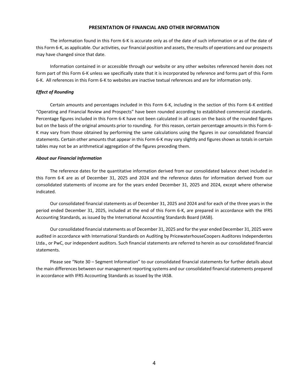4 PRESENTATION OF FINANCIAL AND OTHER INFORMATION The information found in this Form 6-K is accurate only as of the date of such information or as of the date of this Form 6-K, as applicable. Our activities, our financial position and assets, the results of operations and our prospects may have changed since that date. Information contained in or accessible through our website or any other websites referenced herein does not form part of this Form 6-K unless we specifically state that it is incorporated by reference and forms part of this Form 6-K. All references in this Form 6-K to websites are inactive textual references and are for information only. Effect of Rounding Certain amounts and percentages included in this Form 6-K, including in the section of this Form 6-K entitled “Operating and Financial Review and Prospects” have been rounded according to established commercial standards. Percentage figures included in this Form 6-K have not been calculated in all cases on the basis of the rounded figures but on the basis of the original amounts prior to rounding. For this reason, certain percentage amounts in this Form 6- K may vary from those obtained by performing the same calculations using the figures in our consolidated financial statements. Certain other amounts that appear in this Form 6-K may vary slightly and figures shown as totals in certain tables may not be an arithmetical aggregation of the figures preceding them. About our Financial Information The reference dates for the quantitative information derived from our consolidated balance sheet included in this Form 6-K are as of December 31, 2025 and 2024 and the reference dates for information derived from our consolidated statements of income are for the years ended December 31, 2025 and 2024, except where otherwise indicated. Our consolidated financial statements as of December 31, 2025 and 2024 and for each of the three years in the period ended December 31, 2025, included at the end of this Form 6-K, are prepared in accordance with the IFRS Accounting Standards, as issued by the International Accounting Standards Board (IASB). Our consolidated financial statements as of December 31, 2025 and for the year ended December 31, 2025 were audited in accordance with International Standards on Auditing by PricewaterhouseCoopers Auditores Independentes Ltda., or PwC, our independent auditors. Such financial statements are referred to herein as our consolidated financial statements. Please see “Note 30 – Segment Information” to our consolidated financial statements for further details about the main differences between our management reporting systems and our consolidated financial statements prepared in accordance with IFRS Accounting Standards as issued by the IASB.