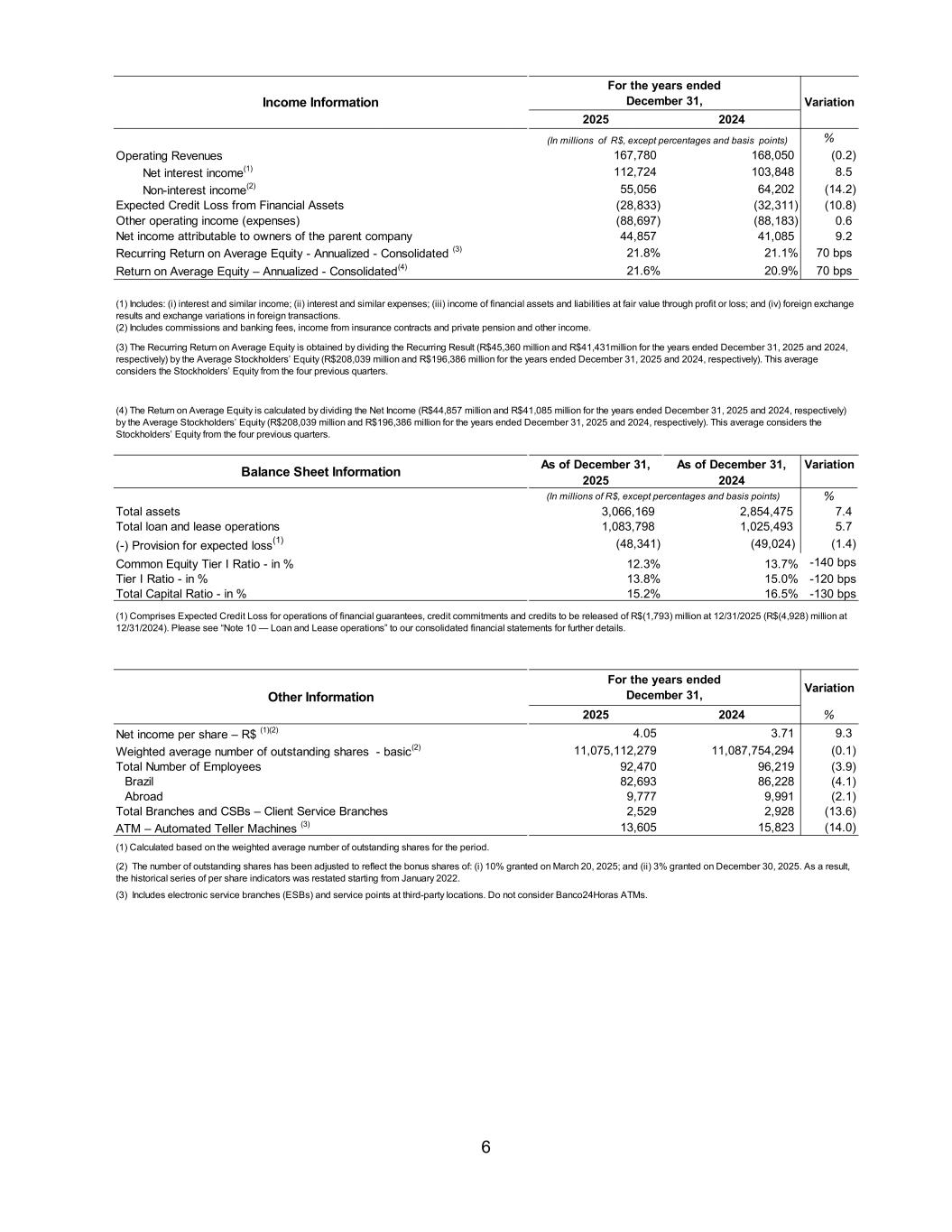6 2025 2024 % Operating Revenues 167,780 168,050 (0.2) Net interest income (1) 112,724 103,848 8.5 Non-interest income (2) 55,056 64,202 (14.2) Expected Credit Loss from Financial Assets (28,833) (32,311) (10.8) Other operating income (expenses) (88,697) (88,183) 0.6 Net income attributable to owners of the parent company 44,857 41,085 9.2 Recurring Return on Average Equity - Annualized - Consolidated (3) 21.8% 21.1% 70 bps Return on Average Equity – Annualized - Consolidated (4) 21.6% 20.9% 70 bps As of December 31, As of December 31, Variation 2025 2024 % Total assets 3,066,169 2,854,475 7.4 Total loan and lease operations 1,083,798 1,025,493 5.7 (-) Provision for expected loss (1) (48,341) (49,024) (1.4) Common Equity Tier I Ratio - in % 12.3% 13.7% -140 bps Tier I Ratio - in % 13.8% 15.0% -120 bps Total Capital Ratio - in % 15.2% 16.5% -130 bps Variation 2025 2024 % Net income per share – R$ (1)(2) 4.05 3.71 9.3 Weighted average number of outstanding shares - basic (2) 11,075,112,279 11,087,754,294 (0.1) Total Number of Employees 92,470 96,219 (3.9) Brazil 82,693 86,228 (4.1) Abroad 9,777 9,991 (2.1) Total Branches and CSBs – Client Service Branches 2,529 2,928 (13.6) ATM – Automated Teller Machines (3) 13,605 15,823 (14.0) Income Information For the years ended December 31, Variation (In millions of R$, except percentages and basis points) (1) Includes: (i) interest and similar income; (ii) interest and similar expenses; (iii) income of financial assets and liabilities at fair value through profit or loss; and (iv) foreign exchange results and exchange variations in foreign transactions. (2) Includes commissions and banking fees, income from insurance contracts and private pension and other income. Other Information For the years ended December 31, (1) Calculated based on the weighted average number of outstanding shares for the period. (3) Includes electronic service branches (ESBs) and service points at third-party locations. Do not consider Banco24Horas ATMs. (3) The Recurring Return on Average Equity is obtained by dividing the Recurring Result (R$45,360 million and R$41,431million for the years ended December 31, 2025 and 2024, respectively) by the Average Stockholders’ Equity (R$208,039 million and R$196,386 million for the years ended December 31, 2025 and 2024, respectively). This average considers the Stockholders’ Equity from the four previous quarters. (4) The Return on Average Equity is calculated by dividing the Net Income (R$44,857 million and R$41,085 million for the years ended December 31, 2025 and 2024, respectively) by the Average Stockholders’ Equity (R$208,039 million and R$196,386 million for the years ended December 31, 2025 and 2024, respectively). This average considers the Stockholders’ Equity from the four previous quarters. Balance Sheet Information (In millions of R$, except percentages and basis points) (1) Comprises Expected Credit Loss for operations of financial guarantees, credit commitments and credits to be released of R$(1,793) million at 12/31/2025 (R$(4,928) million at 12/31/2024). Please see “Note 10 — Loan and Lease operations” to our consolidated financial statements for further details. (2) The number of outstanding shares has been adjusted to reflect the bonus shares of: (i) 10% granted on March 20, 2025; and (ii) 3% granted on December 30, 2025. As a result, the historical series of per share indicators was restated starting from January 2022.