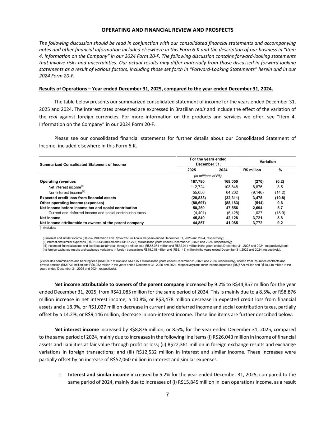 7 OPERATING AND FINANCIAL REVIEW AND PROSPECTS The following discussion should be read in conjunction with our consolidated financial statements and accompanying notes and other financial information included elsewhere in this Form 6-K and the description of our business in “Item 4. Information on the Company” in our 2024 Form 20-F. The following discussion contains forward-looking statements that involve risks and uncertainties. Our actual results may differ materially from those discussed in forward-looking statements as a result of various factors, including those set forth in “Forward-Looking Statements” herein and in our 2024 Form 20-F. Results of Operations – Year ended December 31, 2025, compared to the year ended December 31, 2024. The table below presents our summarized consolidated statement of income for the years ended December 31, 2025 and 2024. The interest rates presented are expressed in Brazilian reais and include the effect of the variation of the real against foreign currencies. For more information on the products and services we offer, see “Item 4. Information on the Company” in our 2024 Form 20-F. Please see our consolidated financial statements for further details about our Consolidated Statement of Income, included elsewhere in this Form 6-K. Net income attributable to owners of the parent company increased by 9.2% to R$44,857 million for the year ended December 31, 2025, from R$41,085 million for the same period of 2024. This is mainly due to a 8.5%, or R$8,876 million increase in net interest income, a 10.8%, or R$3,478 million decrease in expected credit loss from financial assets and a 18.9%, or R$1,027 million decrease in current and deferred income and social contribution taxes, partially offset by a 14.2%, or R$9,146 million, decrease in non-interest income. These line items are further described below: Net interest income increased by R$8,876 million, or 8.5%, for the year ended December 31, 2025, compared to the same period of 2024, mainly due to increases in the following line items (i) R$26,043 million in income of financial assets and liabilities at fair value through profit or loss; (ii) R$22,361 million in foreign exchange results and exchange variations in foreign transactions; and (iii) R$12,532 million in interest and similar income. These increases were partially offset by an increase of R$52,060 million in interest and similar expenses. o Interest and similar income increased by 5.2% for the year ended December 31, 2025, compared to the same period of 2024, mainly due to increases of (i) R$15,845 million in loan operations income, as a result 2025 2024 R$ million % Operating revenues 167,780 168,050 (270) (0.2) Net interest income (1) 112,724 103,848 8,876 8.5 Non-interest income (2) 55,056 64,202 (9,146) (14.2) Expected credit loss from financial assets (28,833) (32,311) 3,478 (10.8) Other operating income (expenses) (88,697) (88,183) (514) 0.6 Net income before income tax and social contribution 50,250 47,556 2,694 5.7 Current and deferred income and social contribution taxes (4,401) (5,428) 1,027 (18.9) Net income 45,849 42,128 3,721 8.8 Net income attributable to owners of the parent company 44,857 41,085 3,772 9.2 (2) Includes commissions and banking fees (R$46,997 million and R$47,071 million in the years ended December 31, 2025 and 2024, respectively), Income from insurance contracts and private pension (R$8,731 million and R$6,982 million in the years ended December 31, 2025 and 2024, respectively) and other income/expenses (R$(672) million and R$10,149 million in the years ended December 31, 2025 and 2024, respectively). Summarized Consolidated Statement of Income For the years ended December 31, Variation (In millions of R$) (1) Includes: (i) interest and similar income (R$254,790 million and R$242,258 million in the years ended December 31, 2025 and 2024, respectively); (ii) interest and similar expenses (R$(219,338) million and R$(167,278) million in the years ended December 31, 2025 and 2024, respectively); (iii) income of financial assets and liabilities at fair value through profit or loss (R$58,054 million and R$32,011 million in the years ended December 31, 2025 and 2024, respectively); and (iv) foreign exchange results and exchange variations in foreign transactions R$19,218 million and (R$3,143) million in the years ended December 31, 2025 and 2024, respectively).