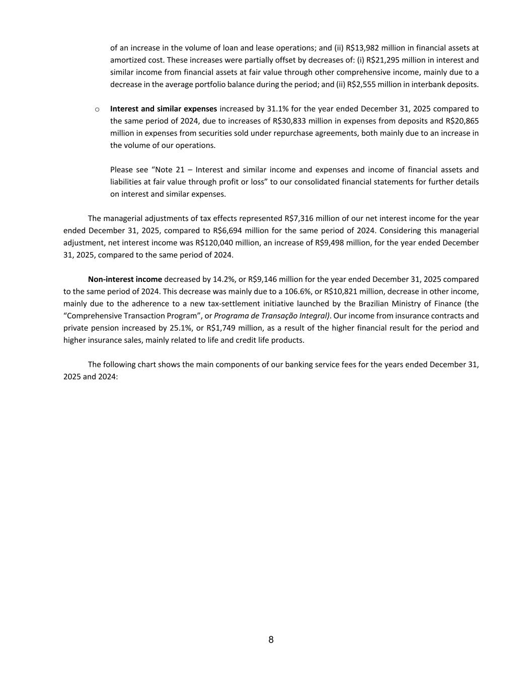 8 of an increase in the volume of loan and lease operations; and (ii) R$13,982 million in financial assets at amortized cost. These increases were partially offset by decreases of: (i) R$21,295 million in interest and similar income from financial assets at fair value through other comprehensive income, mainly due to a decrease in the average portfolio balance during the period; and (ii) R$2,555 million in interbank deposits. o Interest and similar expenses increased by 31.1% for the year ended December 31, 2025 compared to the same period of 2024, due to increases of R$30,833 million in expenses from deposits and R$20,865 million in expenses from securities sold under repurchase agreements, both mainly due to an increase in the volume of our operations. Please see “Note 21 – Interest and similar income and expenses and income of financial assets and liabilities at fair value through profit or loss” to our consolidated financial statements for further details on interest and similar expenses. The managerial adjustments of tax effects represented R$7,316 million of our net interest income for the year ended December 31, 2025, compared to R$6,694 million for the same period of 2024. Considering this managerial adjustment, net interest income was R$120,040 million, an increase of R$9,498 million, for the year ended December 31, 2025, compared to the same period of 2024. Non-interest income decreased by 14.2%, or R$9,146 million for the year ended December 31, 2025 compared to the same period of 2024. This decrease was mainly due to a 106.6%, or R$10,821 million, decrease in other income, mainly due to the adherence to a new tax-settlement initiative launched by the Brazilian Ministry of Finance (the “Comprehensive Transaction Program”, or Programa de Transação Integral). Our income from insurance contracts and private pension increased by 25.1%, or R$1,749 million, as a result of the higher financial result for the period and higher insurance sales, mainly related to life and credit life products. The following chart shows the main components of our banking service fees for the years ended December 31, 2025 and 2024: