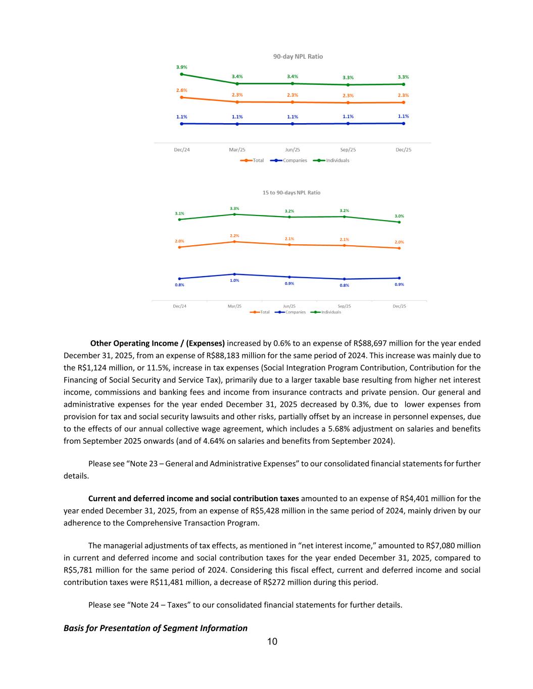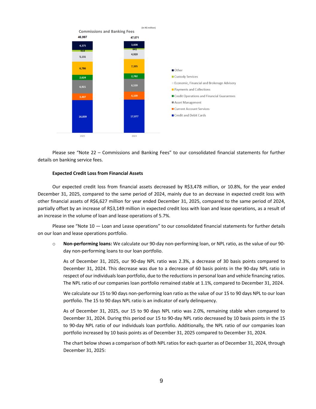 9 Please see “Note 22 – Commissions and Banking Fees” to our consolidated financial statements for further details on banking service fees. Expected Credit Loss from Financial Assets Our expected credit loss from financial assets decreased by R$3,478 million, or 10.8%, for the year ended December 31, 2025, compared to the same period of 2024, mainly due to an decrease in expected credit loss with other financial assets of R$6,627 million for year ended December 31, 2025, compared to the same period of 2024, partially offset by an increase of R$3,149 million in expected credit loss with loan and lease operations, as a result of an increase in the volume of loan and lease operations of 5.7%. Please see “Note 10 — Loan and Lease operations” to our consolidated financial statements for further details on our loan and lease operations portfolio. o Non-performing loans: We calculate our 90-day non-performing loan, or NPL ratio, as the value of our 90- day non-performing loans to our loan portfolio. As of December 31, 2025, our 90-day NPL ratio was 2.3%, a decrease of 30 basis points compared to December 31, 2024. This decrease was due to a decrease of 60 basis points in the 90-day NPL ratio in respect of our individuals loan portfolio, due to the reductions in personal loan and vehicle financing ratios. The NPL ratio of our companies loan portfolio remained stable at 1.1%, compared to December 31, 2024. We calculate our 15 to 90 days non-performing loan ratio as the value of our 15 to 90 days NPL to our loan portfolio. The 15 to 90 days NPL ratio is an indicator of early delinquency. As of December 31, 2025, our 15 to 90 days NPL ratio was 2.0%, remaining stable when compared to December 31, 2024. During this period our 15 to 90-day NPL ratio decreased by 10 basis points in the 15 to 90-day NPL ratio of our individuals loan portfolio. Additionally, the NPL ratio of our companies loan portfolio increased by 10 basis points as of December 31, 2025 compared to December 31, 2024. The chart below shows a comparison of both NPL ratios for each quarter as of December 31, 2024, through December 31, 2025: