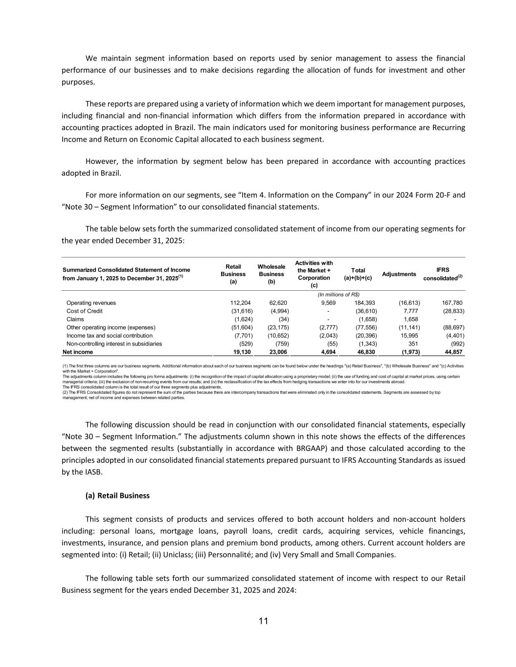 11 We maintain segment information based on reports used by senior management to assess the financial performance of our businesses and to make decisions regarding the allocation of funds for investment and other purposes. These reports are prepared using a variety of information which we deem important for management purposes, including financial and non-financial information which differs from the information prepared in accordance with accounting practices adopted in Brazil. The main indicators used for monitoring business performance are Recurring Income and Return on Economic Capital allocated to each business segment. However, the information by segment below has been prepared in accordance with accounting practices adopted in Brazil. For more information on our segments, see “Item 4. Information on the Company” in our 2024 Form 20-F and “Note 30 – Segment Information” to our consolidated financial statements. The table below sets forth the summarized consolidated statement of income from our operating segments for the year ended December 31, 2025: The following discussion should be read in conjunction with our consolidated financial statements, especially “Note 30 – Segment Information.” The adjustments column shown in this note shows the effects of the differences between the segmented results (substantially in accordance with BRGAAP) and those calculated according to the principles adopted in our consolidated financial statements prepared pursuant to IFRS Accounting Standards as issued by the IASB. (a) Retail Business This segment consists of products and services offered to both account holders and non-account holders including: personal loans, mortgage loans, payroll loans, credit cards, acquiring services, vehicle financings, investments, insurance, and pension plans and premium bond products, among others. Current account holders are segmented into: (i) Retail; (ii) Uniclass; (iii) Personnalité; and (iv) Very Small and Small Companies. The following table sets forth our summarized consolidated statement of income with respect to our Retail Business segment for the years ended December 31, 2025 and 2024: Summarized Consolidated Statement of Income from January 1, 2025 to December 31, 2025 (1) Retail Business (a) Wholesale Business (b) Activities with the Market + Corporation (c) Total (a)+(b)+(c) Adjustments IFRS consolidated (2) Operating revenues 112,204 62,620 9,569 184,393 (16,613) 167,780 Cost of Credit (31,616) (4,994) - (36,610) 7,777 (28,833) Claims (1,624) (34) - (1,658) 1,658 - Other operating income (expenses) (51,604) (23,175) (2,777) (77,556) (11,141) (88,697) Income tax and social contribution (7,701) (10,652) (2,043) (20,396) 15,995 (4,401) Non-controlling interest in subsidiaries (529) (759) (55) (1,343) 351 (992) Net income 19,130 23,006 4,694 46,830 (1,973) 44,857 (In millions of R$) (1) The first three columns are our business segments. Additional information about each of our business segments can be found below under the headings "(a) Retail Business", "(b) Wholesale Business" and "(c) Activities with the Market + Corporation". The adjustments column includes the following pro forma adjustments: (i) the recognition of the impact of capital allocation using a proprietary model; (ii) the use of funding and cost of capital at market prices, using certain managerial criteria; (iii) the exclusion of non-recurring events from our results; and (iv) the reclassification of the tax effects from hedging transactions we enter into for our investments abroad. The IFRS consolidated column is the total result of our three segments plus adjustments. (2) The IFRS Consolidated figures do not represent the sum of the parties because there are intercompany transactions that were eliminated only in the consolidated statements. Segments are assessed by top management, net of income and expenses between related parties.