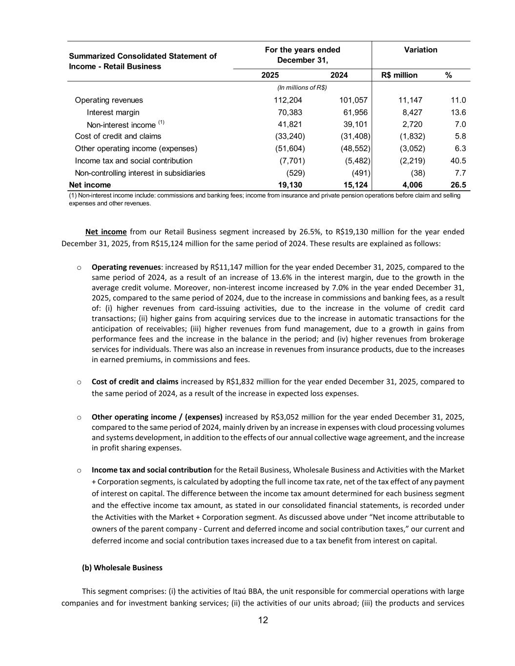 12 Net income from our Retail Business segment increased by 26.5%, to R$19,130 million for the year ended December 31, 2025, from R$15,124 million for the same period of 2024. These results are explained as follows: o Operating revenues: increased by R$11,147 million for the year ended December 31, 2025, compared to the same period of 2024, as a result of an increase of 13.6% in the interest margin, due to the growth in the average credit volume. Moreover, non-interest income increased by 7.0% in the year ended December 31, 2025, compared to the same period of 2024, due to the increase in commissions and banking fees, as a result of: (i) higher revenues from card-issuing activities, due to the increase in the volume of credit card transactions; (ii) higher gains from acquiring services due to the increase in automatic transactions for the anticipation of receivables; (iii) higher revenues from fund management, due to a growth in gains from performance fees and the increase in the balance in the period; and (iv) higher revenues from brokerage services for individuals. There was also an increase in revenues from insurance products, due to the increases in earned premiums, in commissions and fees. o Cost of credit and claims increased by R$1,832 million for the year ended December 31, 2025, compared to the same period of 2024, as a result of the increase in expected loss expenses. o Other operating income / (expenses) increased by R$3,052 million for the year ended December 31, 2025, compared to the same period of 2024, mainly driven by an increase in expenses with cloud processing volumes and systems development, in addition to the effects of our annual collective wage agreement, and the increase in profit sharing expenses. o Income tax and social contribution for the Retail Business, Wholesale Business and Activities with the Market + Corporation segments, is calculated by adopting the full income tax rate, net of the tax effect of any payment of interest on capital. The difference between the income tax amount determined for each business segment and the effective income tax amount, as stated in our consolidated financial statements, is recorded under the Activities with the Market + Corporation segment. As discussed above under “Net income attributable to owners of the parent company - Current and deferred income and social contribution taxes,” our current and deferred income and social contribution taxes increased due to a tax benefit from interest on capital. (b) Wholesale Business This segment comprises: (i) the activities of Itaú BBA, the unit responsible for commercial operations with large companies and for investment banking services; (ii) the activities of our units abroad; (iii) the products and services 2025 2024 R$ million % Operating revenues 112,204 101,057 11,147 11.0 Interest margin 70,383 61,956 8,427 13.6 Non-interest income (1) 41,821 39,101 2,720 7.0 Cost of credit and claims (33,240) (31,408) (1,832) 5.8 Other operating income (expenses) (51,604) (48,552) (3,052) 6.3 Income tax and social contribution (7,701) (5,482) (2,219) 40.5 Non-controlling interest in subsidiaries (529) (491) (38) 7.7 Net income 19,130 15,124 4,006 26.5 Summarized Consolidated Statement of Income - Retail Business For the years ended December 31, Variation (In millions of R$) (1) Non-interest income include: commissions and banking fees; income from insurance and private pension operations before claim and selling expenses and other revenues.
